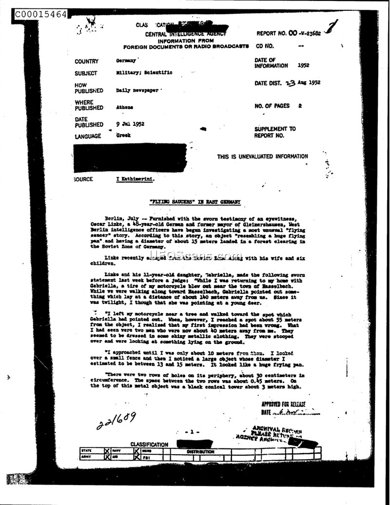 This intelligence report, issued by the Central Intelligence Agency on August 23, 1952, details the sworn testimony of Oscar Linke, a 45-year-old former mayor of Gleimershausen, West Germany. Linke, who had recently escaped from the Soviet Zone of Germany with his wife and six children, provided an account of an encounter with an unidentified aerial object. According to Linke, he and his 11-year-old daughter, Gabriella, were traveling near the town of Hasselbach when they encountered an object described as a 'huge flying pan' with a diameter of approximately 15 meters, resting in a forest clearing. Linke observed two individuals near the object, noting they wore shiny metallic clothing. He approached to within 10 meters of the craft, observing two rows of holes along its periphery and a black conical tower approximately 3 meters high on its top. Linke reported that one of the individuals had a lamp on the front of his body that illuminated at regular intervals. As the observation continued, the object began to emit a slight hum, its color shifted from green to red, and it began to rise from the ground while rotating like a top. Linke described the object being supported by a cylindrical plant that eventually retracted into the center of the craft. The object then rose, surrounded by a ring of flames, and moved toward a neighboring town before disappearing over the forests in the direction of Stockholm. Linke noted that other residents in the area reported seeing an object they believed to be a comet. Upon returning to the site after the object had departed, Linke discovered a circular, freshly dug opening in the ground. Linke stated that he had no prior knowledge of the term 'flying saucer' and initially assumed the object was a new Soviet military machine. He expressed fear regarding the Soviet authorities' restrictions on movement in East Germany, suggesting they were aware of such phenomena.
