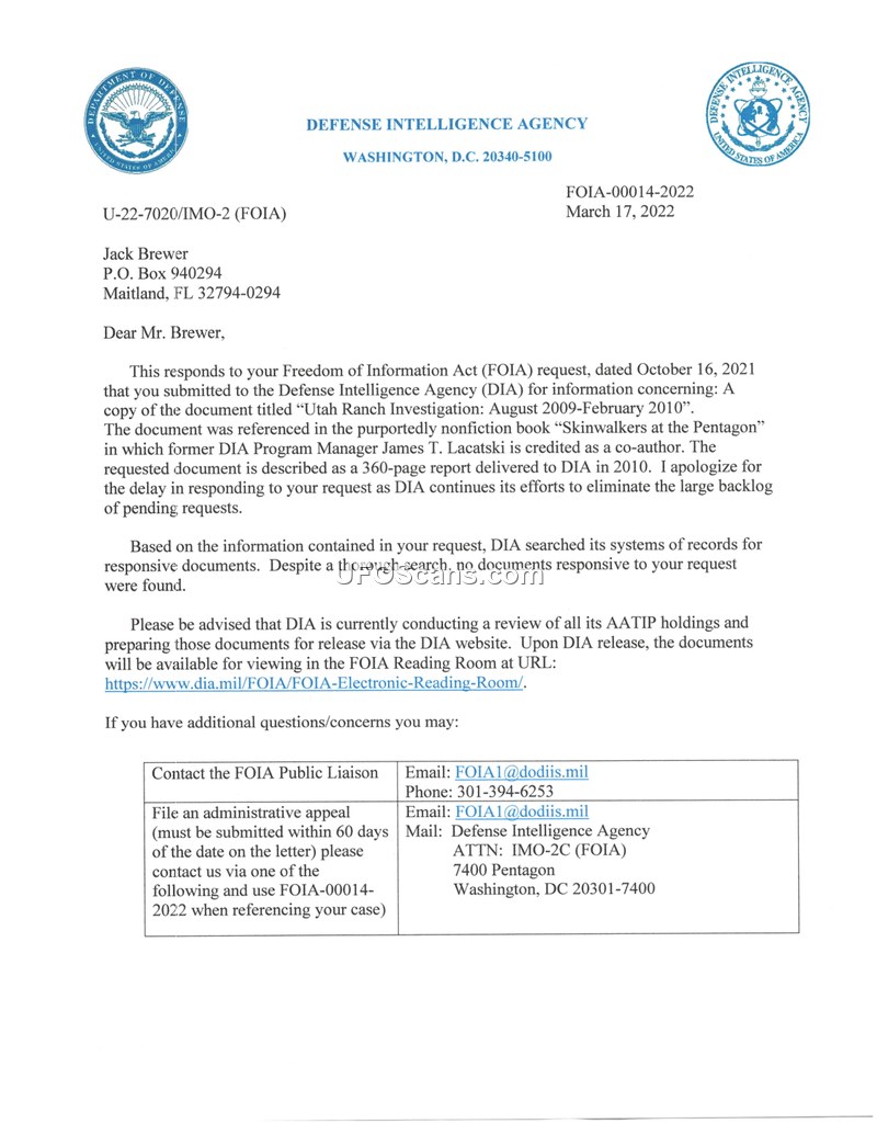 The DIA responded to a FOIA request for the 'Utah Ranch Investigation' report, stating that no responsive documents were found. The agency also noted it is currently reviewing its AATIP holdings for future release.