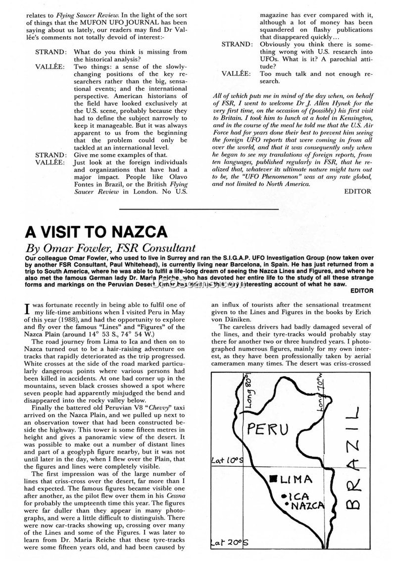 This document, published in Flying Saucer Review, contains two primary sections: a field report titled 'A Visit to Nazca' by Omar Fowler and a book review of a Soviet publication on extraterrestrial civilizations. In the first section, Fowler recounts his 1988 trip to the Nazca Plain in Peru. He describes the landscape, the impact of tourism on the ancient geoglyphs, and the damage caused by modern vehicle tyre-tracks. Fowler details his interactions with Dr. Maria Reiche, a researcher who dedicated her life to studying and protecting the Nazca Lines. He notes that Reiche, at age 85, was nearly blind but remained committed to her work, employing motorcyclists to patrol the area against further damage. Fowler also mentions his search for Dr. Javier Cabrera Darquea, who proposed theories linking the Nazca lines to ancient spacecraft runways. The second section provides a review of the book 'Problema Vnezemnykh Tsivilizatsii: Filosofsko-Metodologicheskie Aspekty' (The Problem of Extraterrestrial Civilizations: Philosophical-Methodological Aspects) by V. V. Rubtsov and A. D. Ursul. The reviewer praises the book for its comprehensive and meticulous scientific approach to the subject of extraterrestrial life, despite the reviewer's own skepticism regarding the 'E.T. Theory' of visitation. The document also includes a brief transcript of a discussion between an editor and Jacques Vallée regarding the history of UFO research, emphasizing the need for an international perspective and the influence of researchers like Olavo Fontes and Dr. Maria Reiche.