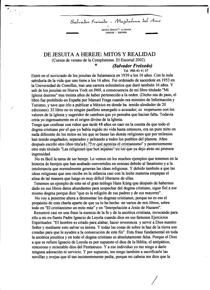 This document consists of a lecture transcript titled 'From Jesuit to Heretic: Myths and Reality,' delivered at the Complutense University in El Escorial in 2002, followed by a personal letter dated September 13, 2002. The author, Salvador Freixedo, a former Jesuit priest, details his departure from the order and his subsequent disillusionment with Christian dogma. Freixedo asserts that religious institutions have historically functioned as tools for mental manipulation, keeping humanity in a state of ignorance. He posits that the 'gods' described in religious texts, such as the Bible, were not divine entities but rather extraterrestrial beings who have influenced human development for their own purposes. He criticizes global power structures, including the 'military-industrial complex' and corrupt political and financial institutions, suggesting they are complicit in maintaining this control. Freixedo claims to have personally witnessed unidentified aerial phenomena, which he believes confirms the presence of these non-human intelligences. He argues that scientific and academic authorities, such as Carl Sagan and others, have actively participated in a campaign of disinformation to suppress the truth about these phenomena. The document concludes with a personal letter to Ignacio Darnaude, in which Freixedo discusses his recent public speaking, dismisses rumors about his personal life, and expresses his continued commitment to his research and beliefs.