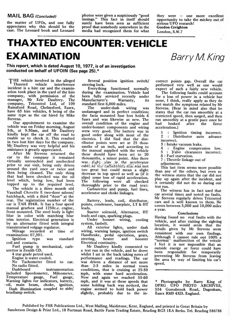 This issue of Flying Saucer Review (Volume 23, No. 4, published January 1978) serves as a comprehensive compilation of UAP-related reports, investigations, and cultural commentary. The editorial focus is heavily influenced by the release of Steven Spielberg's film 'Close Encounters of the Third Kind,' which the magazine views as a significant cultural event that may impact the public perception and reporting of UFO phenomena. The issue features several detailed case studies, including an investigation into 'solid light' phenomena in Dorset by Leslie Harris, a report on a UFO and entity sighting in Morayshire by Jenny Randles, and a follow-up on the 'Man-in-Black' syndrome by Dr. Berthold E. Schwarz. Additionally, Gordon Creighton provides an analysis of a Soviet report regarding a 'jellyfish' UAP observed over Petrozavodsk, Russia, in September 1977. The magazine also includes a technical examination of a vehicle interference case in Thaxted, Essex, conducted by Barry M. King and Andrew Collins, and a follow-up on the Coyne helicopter case by Jennie Zeidman. Beyond these reports, the issue contains book reviews, a 'Mail Bag' section for reader correspondence, and advertisements for UFO-related literature and detection equipment. The overarching tone is one of serious, albeit speculative, inquiry into the nature of UAP, emphasizing the need for rigorous investigation while acknowledging the complexities introduced by public interest and media portrayals.