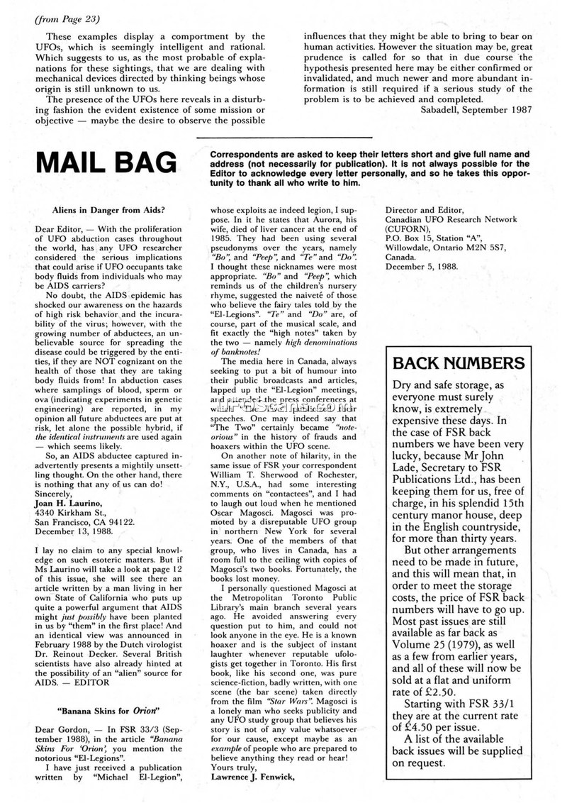 This document is a 1989 issue of Flying Saucer Review containing reports on global UFO sightings, abduction phenomena, and alleged links between UFOs and biological events like cattle mutilations and the AIDS epidemic. It provides detailed case studies from Canada, Brazil, and Spain, including pilot testimonies and radar-confirmed encounters.