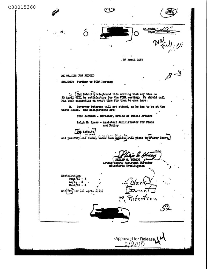 This memorandum, dated 24 April 1953, serves as a record regarding an upcoming meeting with the Federal Civil Defense Administration (FCDA). The document notes that Ted Babbitt contacted the office to confirm that any time on 30 April would be acceptable for the meeting. It further clarifies that Governor Peterson would be unable to attend due to commitments at the White House. The document lists the designations for John DeChant, Director of the Office of Public Affairs, and Ralph E. Spear, Assistant Administrator for Plans and Policy. It concludes by noting that Ted Babbitt, and potentially one other individual, would contact D'Arcy Brent regarding the meeting arrangements. The document is signed by Philip G. Strong, Acting Deputy Assistant Director of Scientific Intelligence.