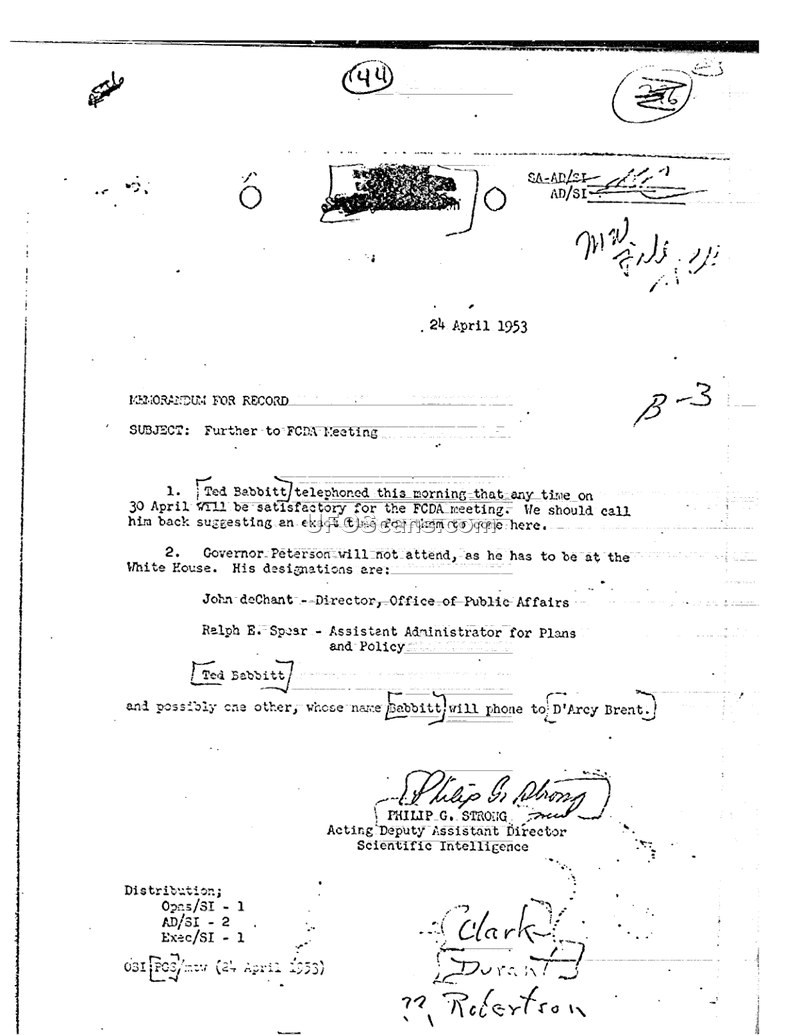 This memorandum, dated 24 April 1953, serves as a record regarding the scheduling of a meeting with the Federal Civil Defense Administration (FCDA). The document notes that Ted Babbitt telephoned the office to confirm that any time on 30 April 1953 would be acceptable for the FCDA meeting, and suggests that the office should contact him to finalize the specific time. Additionally, the document records that Governor Peterson would be unable to attend the meeting due to commitments at the White House. The memorandum lists the designations for John deChant, Director of the Office of Public Affairs, and Ralph E. Spear, Assistant Administrator for Plans and Policy. It concludes by noting that Babbitt would contact D'Arcy Brent regarding an additional attendee. The document is signed by Philip G. Strong, Acting Deputy Assistant Director for Scientific Intelligence.