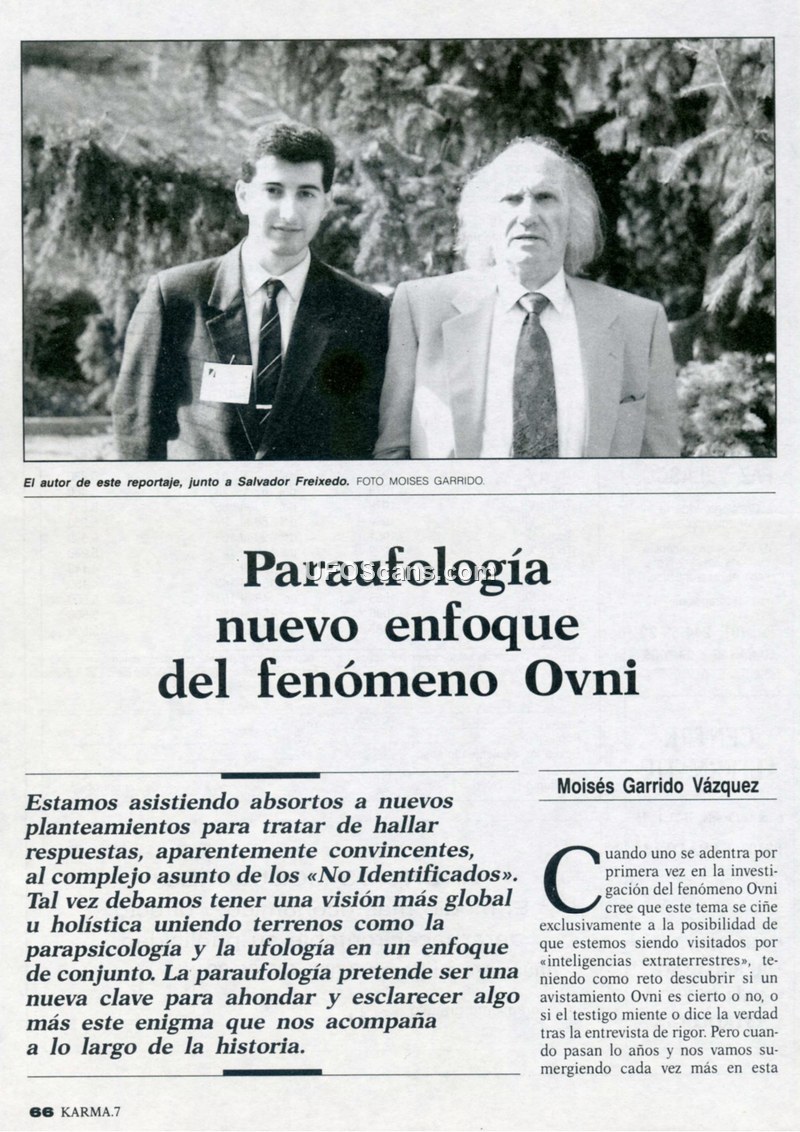 This article, published in the March 1991 issue of KARMA.7 by Moisés Garrido Vázquez, introduces the concept of 'Paraufology' as a necessary, holistic framework for investigating the UFO phenomenon. The author argues that traditional ufology, which focuses exclusively on the Extraterrestrial Hypothesis (ETH), is insufficient to explain the complexity of the subject. Instead, he suggests that ufology must integrate with parapsychology to account for the psychic and sociological dimensions of the phenomenon.
