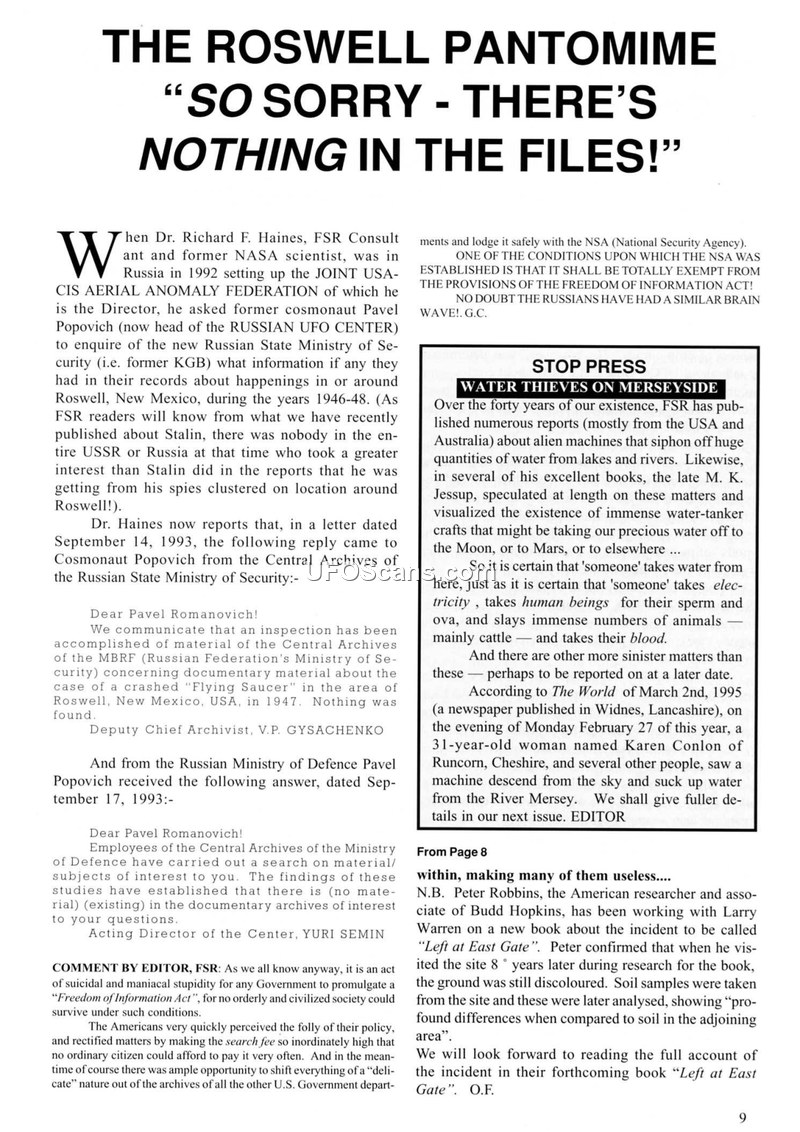 This document is a compilation of reports and commentary published by the Flying Saucer Review (FSR). It begins by detailing inquiries made by Dr. Richard F. Haines to the Russian State Ministry of Security and the Ministry of Defence regarding the 1947 Roswell incident. Official responses from Deputy Chief Archivist V.P. Gysachenko and Acting Director Yuri Semin state that no documentary evidence exists in their archives concerning the event. The text also includes a report from the 'World' newspaper regarding a sighting in Runcorn, Cheshire, where a witness, Karen Conlon, observed a machine descending to extract water from the River Mersey. The document further discusses the activities of researcher Peter Robbins regarding the 'Left at East Gate' incident, noting soil discoloration at the site. A significant portion of the document is dedicated to an article by Paul Whitehead concerning Uri Geller, who discusses his interactions with government agencies, his theories on UFOs as extraterrestrial intelligences, and his belief that UFOs are involved in crop circle formation. Geller also touches upon his views on the 'face on Mars' and his advocacy for nuclear disarmament. Finally, the document includes an article by Gordon Creighton regarding the 'Fifth Mind and Brain Symposium' held at the Institute of Psychiatry in London, which explored scientific evidence for human survival after death and the potential for the mind to operate independently of the brain, citing research by Professor Robert Jahn and Dr. Peter Fenwick.