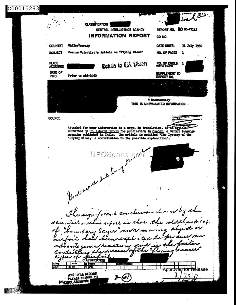 This document is a Central Intelligence Agency Information Report dated July 31, 1950, containing a translation of an article titled 'The Mystery of the Flying Discs: A contribution to its possible explanation' by Dr. Eduard Ludwig, originally published in the German-language magazine 'Condor' in Chile. The report serves as an intelligence assessment regarding the potential origins of 'flying discs' or 'flying saucers.' Dr. Ludwig, who claims to have worked at the Junkers aircraft plant in Dessau, argues that these phenomena are not mysterious or extraterrestrial, but rather the culmination of advanced German aerodynamic research. He traces the theoretical foundations of this technology back to the work of Professors Kutta, Bauman, Prandtl, and Bets, as well as Constructor Flattner. The core of his argument centers on the control of the 'boundary layer' of air over an airfoil. By utilizing gas-turbines and rotating cylinders (the 'Flettner-Rotor'), he suggests that aircraft can achieve superior lift and stability. He notes that German research into supersonic speeds and rocket technology (specifically the V-2) provided the necessary data for such advancements. Ludwig expresses concern that this technology, along with potential atomic weapon developments, may have fallen into the hands of the Soviet Union. The document includes a handwritten marginal note from an intelligence officer describing the report as a 'Good report but lousy translation.'