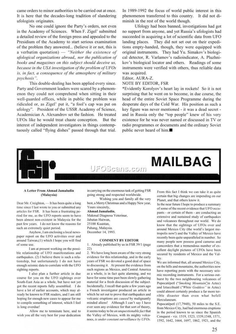 This document consists of excerpts from the Flying Saucer Review (FSR), covering various international perspectives on UAP phenomena. The text begins with a historical overview of ufology in the Soviet Union, noting that despite the skepticism of the Academy of Sciences and the fear of military leaders, independent investigators continued to collect data. A letter from Ahmad Jamaludin in Malaysia discusses the lack of recent UFO reports in his region but highlights the potential for seismic activity correlations with UAP sightings near volcanoes in Mexico, specifically Popocatépetl and Iztaccíhuatl. The document also addresses controversies surrounding photographic evidence, specifically the case of Amauri Rivera in Puerto Rico, which faced skepticism from MUFON-CES. Finally, the text includes a correction regarding the military rank of Robert O. Dean, clarifying that he retired as a Command Sergeant Major rather than a Colonel, and discusses the administrative confusion surrounding his service records and the U.S. Air Force's Project Blue Book.