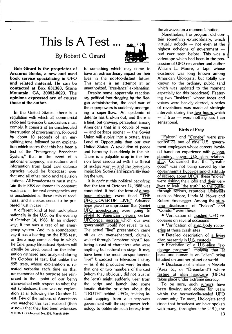 This article, written by Robert C. Girard and published in the March 1989 issue of the MUFON UFO Journal, analyzes a television broadcast that aired on October 14, 1988. Girard characterizes this event as a test of public reaction and a component of a broader, long-term indoctrination program. The author claims that the broadcast featured a videotape held by researcher William L. Moore, which included testimony from two alleged government insiders identified as 'Falcon' and 'Condor.' These individuals purportedly revealed information regarding crashed UFOs, alien bodies, and a secret U.S. alien-human exchange program. Girard argues that the broadcast was intentionally staged to appear amateurish, serving as a psychological conditioning tool. He outlines a multi-faceted strategy involving the use of 'free speech' to disseminate information through ufologists, the discrediting of organized ufology, and the eventual goal of creating a global community under central control. The author suggests that this process has been ongoing since the 1940s, aiming to prepare humanity for the eventual disclosure of an alien presence and the subsequent surrender of national identities. Girard concludes that the lack of significant public or government reaction to the broadcast indicates the success of this conditioning, warning readers that the next phase of this 'invasion' may involve the unification of global political structures.
