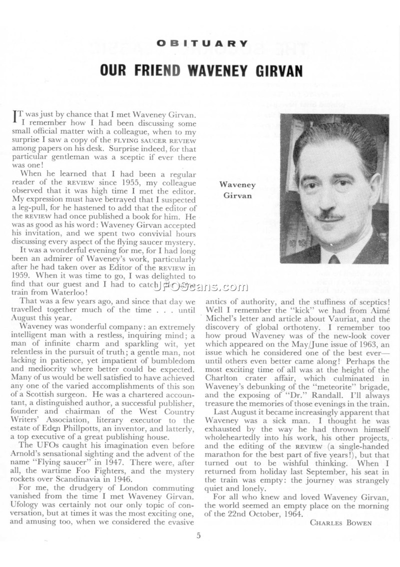 This document is an obituary for Waveney Girvan, written by Charles Bowen. Girvan was a significant figure in the field of Ufology, having served as the editor of the FLYING SAUCER REVIEW since 1955. The author recounts his first meeting with Girvan, noting that he was surprised to find a sceptic reading the publication. Girvan is described as an intelligent, charming, and restless man who was a chartered accountant, a distinguished author, a successful publisher, and the chairman of the West Country Writers’ Association. He also served as the literary executor for the estate of Eden Phillpotts. Girvan’s interest in UFOs was sparked by the Arnold sighting in 1947, as well as the wartime Foo Fighters and the mystery rockets over Scandinavia in 1946. The author highlights Girvan’s work in the field, including his collaboration with Aimé Michel on global orthoteny and his efforts to debunk the 'meteorite' brigade during the Charlton crater affair. In his final years, Girvan suffered from exhaustion due to his single-handed dedication to editing the FLYING SAUCER REVIEW. He passed away on the morning of October 22, 1964.