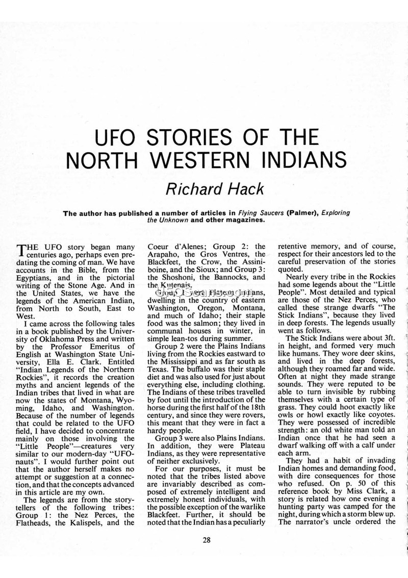 This document, written by Richard Hack, explores the intersection of historical Native American legends and modern UFO phenomena. The author references a book by Professor Ella E. Clark, which documents various tribal accounts of 'Little People'—dwarfish beings often described as living in deep forests, possessing great strength, and sometimes exhibiting cannibalistic or aggressive behavior toward humans. These legends are presented as potentially related to modern UFO sightings. The text details specific tribal groups, including the Nez Perces, Flatheads, and Shoshoni, and their interactions with these entities. Furthermore, the document includes a report of a 1965 sighting in British Columbia involving a geologist named John Hembling. Hembling and a companion observed a 50-foot diameter, delta-wing-shaped object hovering over a lake. The object, which featured a dome, windows, and circular markings, lowered a pipe-like instrument to draw water while emitting a humming sound. The object then departed at an estimated speed of 3,600 m.p.h. The author concludes by suggesting that researchers should investigate these areas for potential links between historical accounts and modern alien contact.