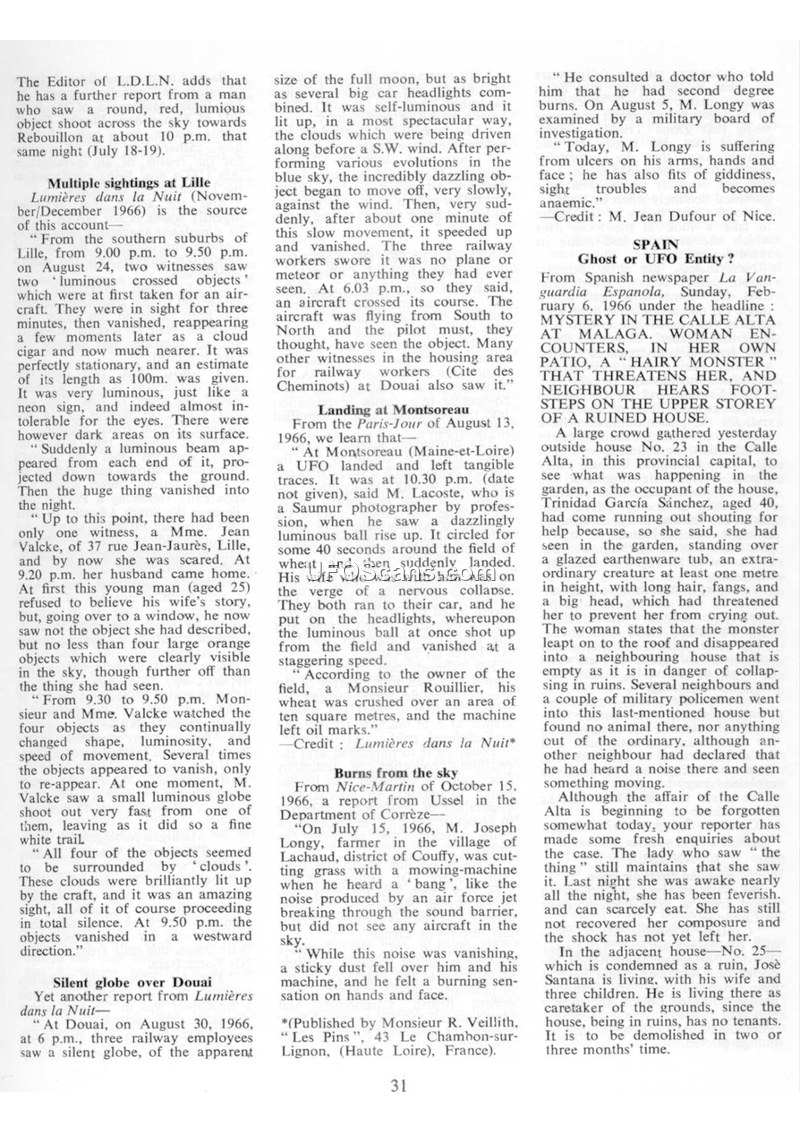 This document is a compilation of international press reports regarding Unidentified Aerial Phenomena (UAP) occurring between 1966 and 1967. The reports cover a wide geographic range, including sightings in France (Lille, Montsoreau, Douai, and Lachaud), Spain (Malaga), and Angola. In France, witnesses reported various luminous objects, some of which were described as cigar-shaped or luminous balls, with one instance involving physical traces in the form of machine oil marks in a field. One French farmer, M. Joseph Longy, reported physical health deterioration following an encounter. In Spain, a report from Malaga describes a 'hairy monster' seen by a woman, Trinidad García Sánchez, near a ruined house. In Angola, a Portuguese airline pilot, Captain Henrique Maya, reported being escorted by two luminous objects for two minutes. The document also discusses the broader scientific and governmental context of the era, noting the involvement of Dr. J. Allen Hynek and Dr. James McDonald in advocating for serious scientific study of UFOs. It mentions NASA's potential involvement in UAP research and references historical radar incidents at Cape Kennedy in 1964. The compilation serves as a record of public and media interest in the phenomenon during the mid-1960s.
