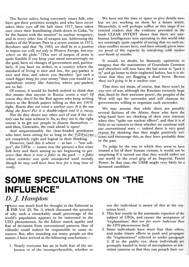 This document consists of two articles from the Flying Saucer Review (FSR). The first, by D.J. Hampton, explores the 'influence' of non-human intelligences on global politics and human perception. Hampton posits that these entities may be interfering with nuclear capabilities and manipulating public opinion to ensure that the UFO phenomenon remains either ignored or dismissed as ridiculous. He discusses the potential for microwave radiation as a mechanism for both the physical effects observed in close-encounter cases and the auditory phenomena reported by witnesses. He cites various cases, including those of Dionisio Llanca, Sonny Desvergers, and the Fátima incident, to support the theory that high-power EM radiation is a key component of UFO activity. The second article, by Antonio Ribera, discusses the nature of abduction reports. Ribera argues that while many abduction narratives are dismissed as perinatal memories or psychological phenomena, the consistency of the reports—specifically the 'medical inspection' and the presence of 'crews'—warrants serious investigation. He notes that abductees often recall these events under hypnosis, and that the entities involved are frequently described as short, macrocephalic humanoids. Ribera emphasizes the need to distinguish between the core abduction experience and the subsequent psychological interpretation.