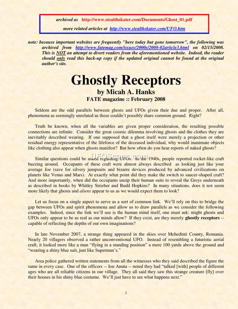This article, published in the February 2008 issue of FATE magazine by Micah A. Hanks, explores the conceptual parallels between ghost sightings and UFO encounters. Hanks posits that both phenomena may be linked to the human mind, acting as 'ghostly receptors' that manifest based on cultural expectations and collective imagination. The author highlights the evolution of UFO reports, noting that descriptions shifted from mechanical, rocket-like craft in the 1940s to more high-tech saucer shapes as science fiction gained popularity. To illustrate this, the article details a sighting in late November 2007 in Mehedinti County, Romania, where nearly 20 villagers reported seeing a man flying in a standing position, wearing a shiny blue suit described as resembling Superman. Local police, including officer Ion Anuta, collected consistent statements from witnesses, including villager Constantin Toader, who confirmed the figure made no sound or smoke. The article also features commentary from an independent researcher using the alias 'Mobius,' who argues that UFOs and their occupants may possess technology capable of interpreting and reflecting ideas from the collective human consciousness. Mobius shares a personal account from the winter of 2000, where he witnessed a cigar-shaped craft that appeared to be a manifestation of collective memory, resembling a 'cheesy 1940s movie' rather than an objective reality. The piece concludes by suggesting that these encounters, whether objective or illusory, are deeply tied to the cultural context of the witnesses.
