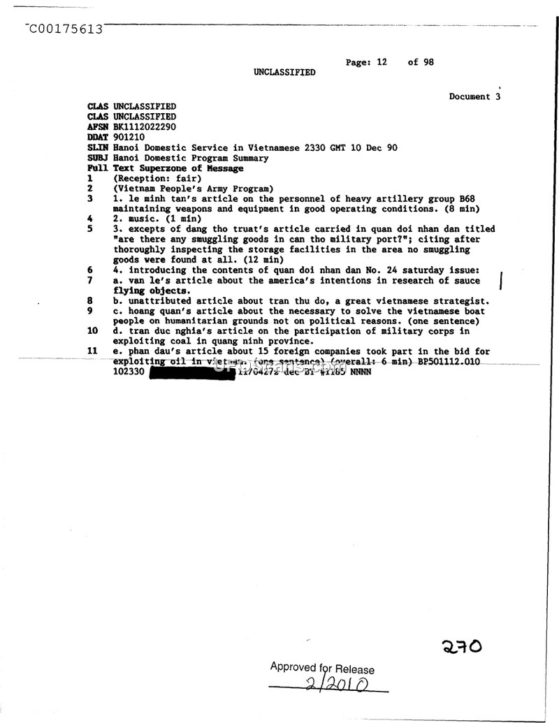 This document is a summary of the Hanoi Domestic Service broadcast from December 10, 1990. The broadcast covered a variety of domestic and international topics. Military-related content included an article by Le Minh Tan regarding the personnel and equipment maintenance of heavy artillery group B68, and an article by Dang Tho Truat concerning smuggling activities within a military port. The broadcast also featured an article by Van Le discussing American intentions regarding the research of 'sauce flying objects.' Other segments included an unattributed piece on the Vietnamese strategist Tran Thu Do, an article by Hoang Quan regarding the Vietnamese boat people, a report by Tran Duc Nghia on the involvement of military corps in coal exploitation in Quang Ninh province, and an article by Phan Dau concerning the bidding process of 15 foreign companies for oil exploration in Vietnam.