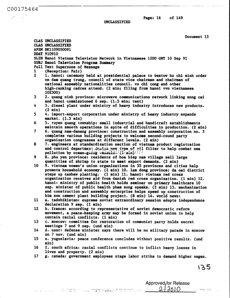 This document provides a summary of a Hanoi television broadcast from September 10, 1991, covering domestic Vietnamese news and international events. It includes a brief mention that UFOs are considered a myth by scientists.