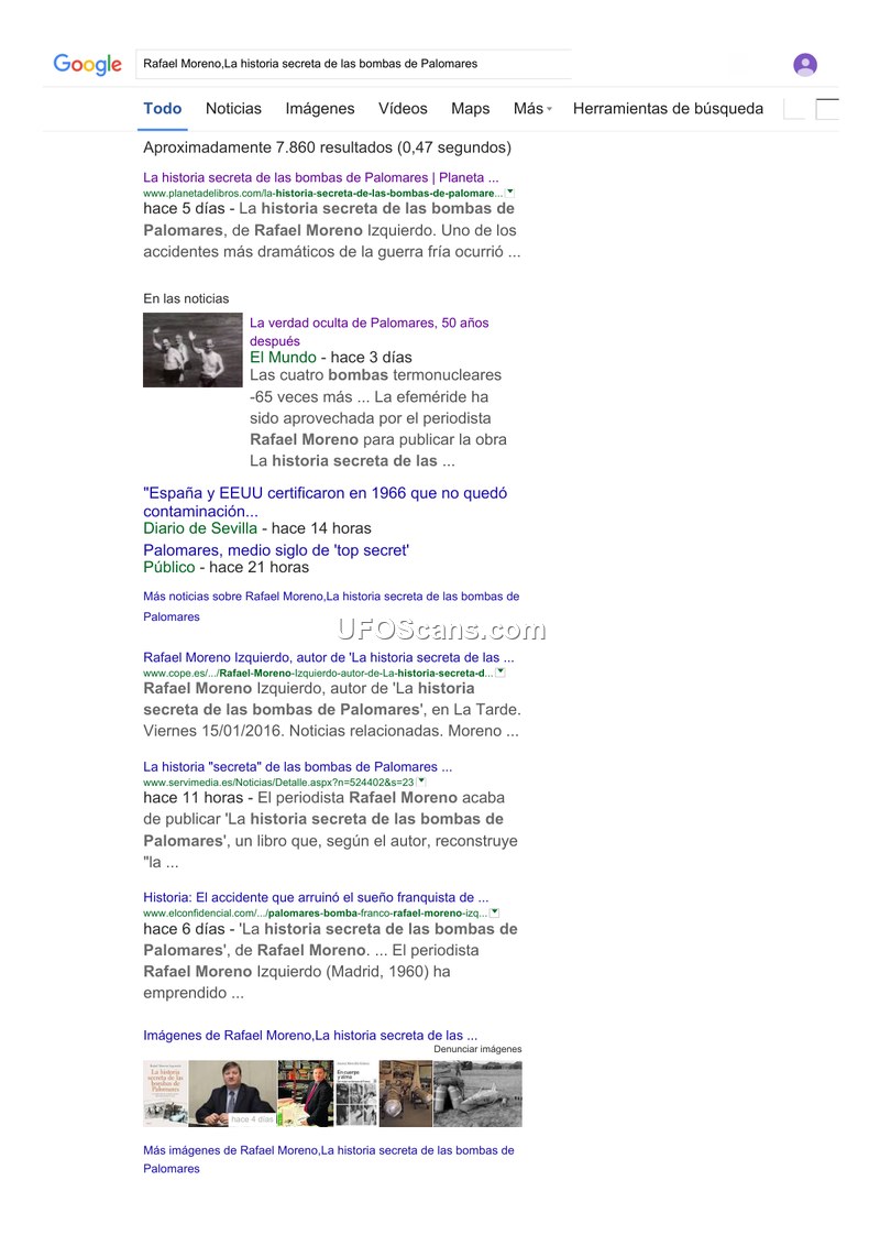 This document consists of a series of search engine results related to the 1966 nuclear accident in Palomares, Spain. The primary focus of these results is the release of a book titled 'La historia secreta de las bombas de Palomares' (The Secret History of the Palomares Bombs), authored by journalist Rafael Moreno Izquierdo. The search results date from approximately January 2016, marking the 50th anniversary of the incident. The snippets indicate that the book aims to reconstruct the events surrounding the loss of four thermonuclear bombs and the subsequent efforts to address the resulting contamination. Various media outlets, including El Mundo, Diario de Sevilla, Público, and El Confidencial, are cited as having covered the book's release and the ongoing historical interest in the 'top secret' nature of the accident. The results also touch upon the official certifications provided by Spain and the United States in 1966 regarding the status of contamination in the area.