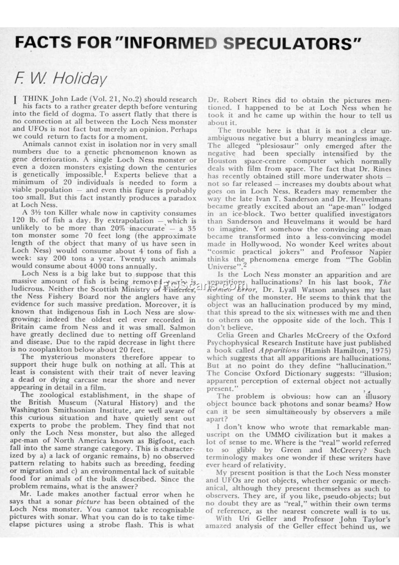 This document consists of two distinct sections. The first, authored by F.W. Holiday, critiques the methodology and conclusions of various researchers regarding the Loch Ness monster. Holiday argues against the existence of the creature based on biological constraints, such as the lack of sufficient food sources in the loch, and challenges the validity of sonar and photographic evidence presented by others like Dr. Robert Rines. He expresses skepticism toward the 'ape-man' theory and critiques the use of the term 'hallucination' by authors like Celia Green and Charles McCreery, suggesting that the phenomena are 'pseudo-objects' that are 'real' within their own frame of reference. The second section, written by Gordon Creighton, details a report from the journal Cuarta Dimension regarding an encounter with 'tiny entities' in Colombia. On August 10, 1973, four schoolboys from the Escuela Normal in Ibagué were gathering botanical specimens near the El Jordan ravine when they observed four small, human-like figures. These entities were described as being no more than 20 centimeters tall, dressed in white, and wearing grey caps. The report notes that the boys found footprints in the mud, which were documented by photographs. Rafael Barrero Cortes, director of the Cirex research group, investigated the incident, and the report highlights that the story became a significant topic of conversation throughout the Colombian Republic.