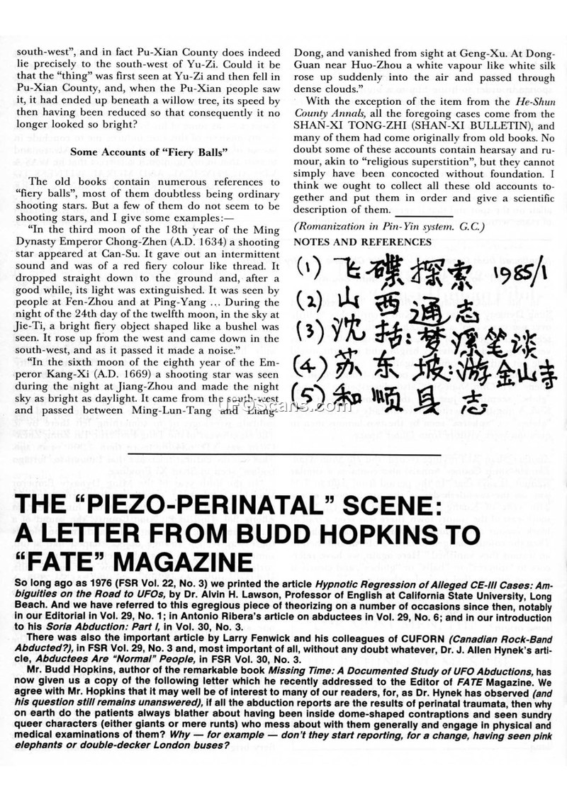 This document is a compilation of articles and correspondence from FATE Magazine, primarily focusing on the debate surrounding UFO abduction accounts and the 'perinatal' theory proposed by Professor Alvin H. Lawson. The first section provides historical context, citing ancient Chinese records from the SHAN-XI TONG-ZHI regarding 'fiery balls' or unidentified aerial phenomena. The core of the document is a letter from Budd Hopkins to the editor of FATE Magazine, dated March 15, 1985. In this letter, Hopkins strongly critiques Lawson's theory that UFO abduction narratives are merely 'fetus-like' memories of the birth process. Hopkins argues that Lawson's theory is unfalsifiable and ignores the specific, often contradictory details provided by abductees, such as the absence of birth-related pain or the presence of specific medical instruments. Hopkins advocates for a return to empirical data collection and the investigation of physical evidence. The document also includes a brief mention of clinical psychologist David Chamberlain, who suggests that children can have accurate, vivid memories of their own births, providing a different perspective on birth-related recall. Finally, the document presents a specific case report from Brazil, investigated by Edgardo R. Fontanet of the G.I.I.F.O. UFO Research Group. The case involves a 20-year-old student, José Ignacio Alvaro, who reported an encounter in Pelotas on March 2, 1978. The witness described an electricity failure followed by the appearance of a bluish light and a subsequent loss of consciousness, fitting the established pattern of contactee reports.