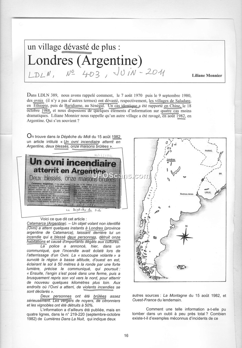 This document is a compilation of articles from the French ufological periodical 'Lumières Dans La Nuit' (LDLN), published in 2011. The primary focus is on documenting historical incidents where Unidentified Aerial Phenomena (UAP/OVNI) were allegedly associated with significant physical destruction, injuries to humans and animals, and environmental damage. The compilation includes detailed reports of village destruction in Ethiopia (1970), Senegal (1980), Argentina (1982), and China (1988). It also examines the 1963 Arpajon incident, where a factory fire was initially linked to a mysterious aircraft, and discusses the recurring phenomenon of mass bird deaths, which the authors argue is not a new occurrence. The document also features a report on a 2010 incident in Sanalakhedha, India, involving alleged crop damage and a fire. Throughout the text, the authors express frustration with the lack of mainstream media coverage and the tendency for such events to be forgotten or dismissed. They advocate for a more systematic approach to documenting these cases, citing various sources including newspaper clippings, academic papers, and personal investigations. The document also touches upon other topics, such as a symposium featuring Bulgarian scientist Lachezar Filipov and his views on extraterrestrial life, and the analysis of photographic evidence.