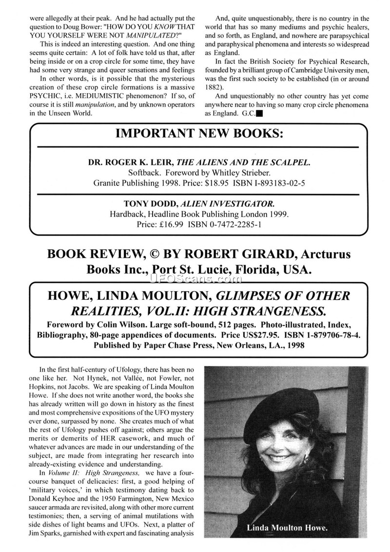 This document, appearing to be an excerpt from the Flying Saucer Review (FSR), provides a multifaceted look at the state of ufology in the late 1990s. It begins by addressing the phenomenon of crop circles, questioning whether they are manipulated by unknown operators in the 'Unseen World' and noting the prevalence of psychic research in England. The text then transitions into a series of book reviews and promotional material for prominent ufology authors, including Dr. Roger K. Leir, Tony Dodd, and Linda Moulton Howe. Linda Moulton Howe is highlighted for her extensive work in the field, including her documentation of animal mutilations and her involvement in television productions like 'Sightings'. The document also features an article by Don Worley titled 'A World Under Assault,' which details his research into alien abduction cases. Worley describes his methodology for evaluating abductees, specifically citing cases #102 (Wanda) and #93 (Kim). He claims that abductees are subjected to implants, brainwashing, and forced participation in hybrid breeding programs. Worley asserts that these activities occur in underground or undersea bases and that the aliens involved are interested in human reproductive material. He further alleges that some abductees are genetically altered and that there is a military presence involved in these activities, noting a case where a military man was detained by aliens and subsequently listed as missing. The document concludes with an editorial appeal for readers to support the FSR magazine to ensure its survival, emphasizing the importance of increasing circulation to maintain the publication's role in the field of ufology.