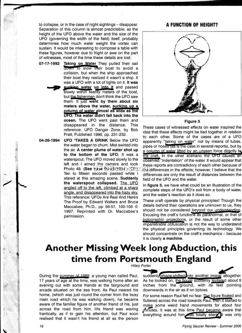 This document is a compilation of articles from the Summer 2006 issue of Flying Saucer Review. It presents a series of anecdotal reports and analytical pieces regarding Unidentified Aerial Phenomena (UAP) and humanoid encounters. The text details several specific incidents, including a 1992 sighting of a UFO drawing water from the ocean, a 1994 report of a water-spout-like phenomenon associated with a craft, and a 1989 abduction case in Portsmouth, England, involving a witness named Paul who experienced missing time and alleged mental manipulation. The document also explores the concept of 'giant' humanoid entities, citing reports from the 1960s and 1970s in the United Kingdom, and a 1971 encounter in Bradenton, Florida, by a police officer who described a voice communicating internally. Further sections discuss the potential for holographic projections and 'soft spot' portals, as well as physical effects on witnesses, such as skin rashes and intestinal disorders following close encounters. The authors argue that these phenomena, while appearing paranormal, may be manifestations of advanced, albeit unknown, machine-based technology that utilizes plasma projection and mind control to interact with or influence human witnesses. The compilation serves as a repository for these diverse accounts, aiming to categorize commonalities such as the use of 'black-clad' figures, giant humanoids, and the distortion of physical structures.