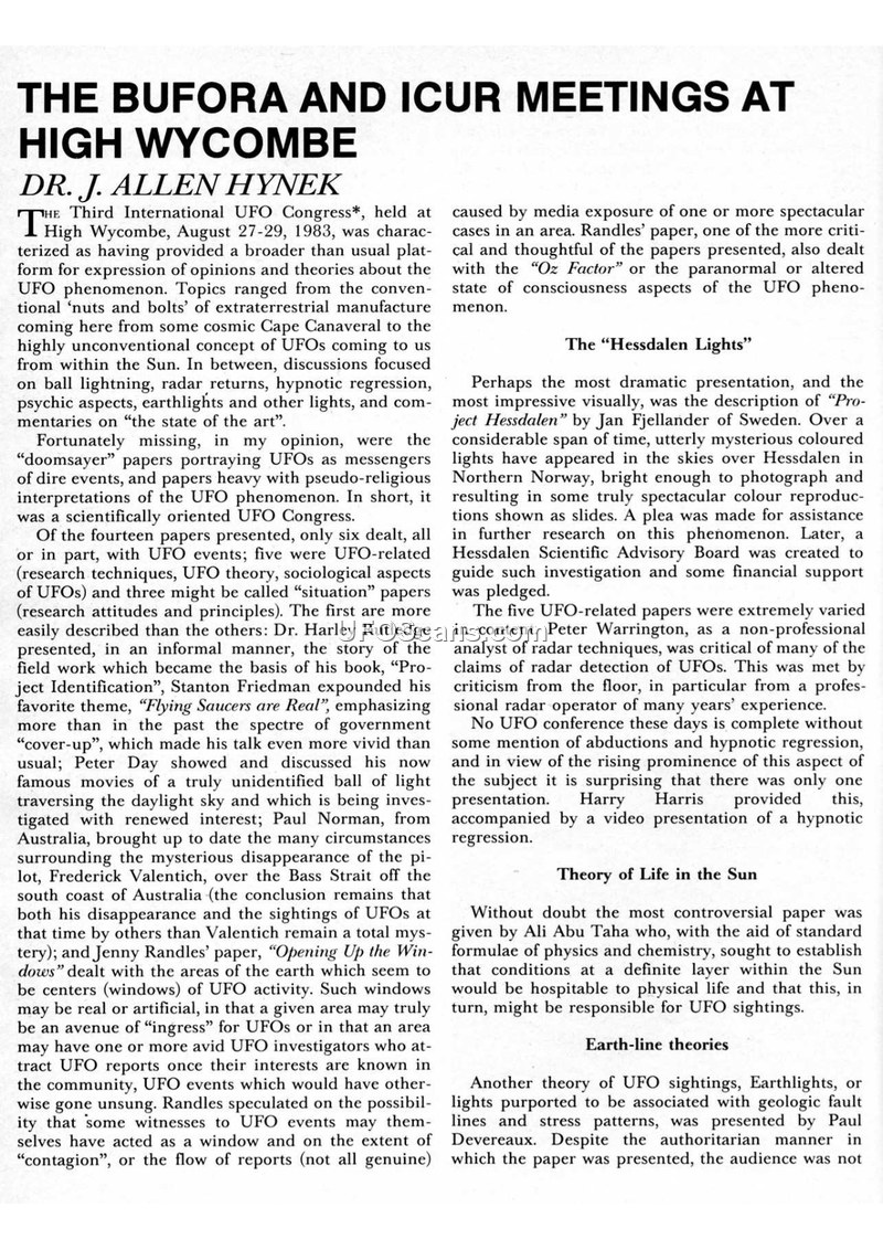 This document provides a detailed overview of the Third International UFO Congress held in High Wycombe in August 1983, as reported by Dr. J. Allen Hynek. The congress served as a platform for diverse theories regarding the UFO phenomenon, ranging from conventional radar and field research to more speculative concepts involving the Sun and geological stress patterns. Notable presentations included discussions on the 'Oz Factor' or altered states of consciousness, the 'Hessdalen Lights' in Norway, and the 'Project Identification' field work led by Dr. Harley Rutledge. The congress also addressed the social and scientific challenges of Ufology, with speakers like Hilary Evans and Bertil Kuhlemann discussing the need for rigorous standards and the difficulty of quantifying UFO data. A significant organizational development occurred during the congress, as the Provisional Committee for UFO Research (PICUR) formally transitioned into ICUR, an international association aimed at fostering cooperation and standardizing research across different countries. The document also features a historical analysis by Thomas E. Bullard regarding 'phantom airship' waves over Poland in 1892. Bullard argues that these sightings, characterized by cigar-shaped objects with searchlights, represent a significant precursor to later UFO phenomena, noting that contemporary reports from 1892 described these objects traversing the border between Germany and Russia, causing military concern and triggering defensive maneuvers.
