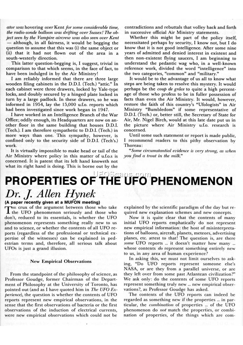 This document is a compilation of articles and commentary regarding the UFO phenomenon, featuring a primary essay by Dr. J. Allen Hynek titled 'Properties of the UFO Phenomenon.' Hynek argues that the UFO phenomenon represents new empirical observations that cannot be explained by the scientific paradigm of the day. He emphasizes the need for rigorous investigation, criticizing authorities who dismiss reports without proper testing. Hynek notes that he has reviewed over 400 cases to identify reported properties, such as high-speed flight and hovering, which distinguish UFOs from known objects like meteors or helicopters. The document also includes a section on 'More Books on UFOs in China,' discussing the challenges of reporting UFO sightings in a communist state, and a list of publications available from the 'UFO and Space Age Publications' catalog. The text highlights the historical tendency of science to reject new concepts that do not fit existing frameworks, citing Niels Bohr's observation that 'progress in science is impossible without a paradox.' Throughout the text, there is a recurring theme of skepticism toward official government handling of UFO data, particularly regarding the British Air Ministry and the lack of transparency in China.