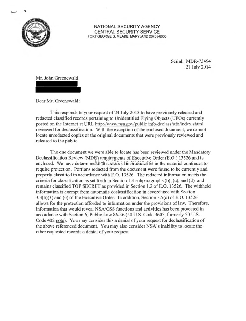 This document consists of a 2014 response from the National Security Agency (NSA) to a Freedom of Information Act (FOIA) request submitted by John Greenewald regarding records on Unidentified Flying Objects (UFOs). The NSA states that it could not locate unredacted copies of previously released records, with the exception of one document provided with the response. The agency maintains that the withheld information is properly classified as TOP SECRET UMBRA and is exempt from disclosure under various provisions of Executive Order 13526 and Public Law 86-36, as it pertains to NSA/CSS functions and activities. The response includes an in-camera affidavit from Eugene F. Yeates, Chief of the Office of Policy, which was originally submitted in the context of Civil Action No. 80-1562. This affidavit provides a detailed explanation of why the NSA withholds 156 records classified as communications intelligence (COMINT). Yeates explains that these records, produced between 1958 and 1979, are based on intercepted communications from foreign governments. He argues that disclosing these reports would compromise the NSA's ability to gather intelligence, reveal specific interception capabilities, and identify foreign intelligence targets. The affidavit categorizes the records based on their source—second party, third party, or NSA-originated—and describes how they contain information about foreign air defense systems, military build-ups, and other sensitive data. The NSA explicitly states that 'UFOs,' 'extra-terrestrials,' and 'paranormal activities' do not relate to its mission, and that records in its files labeled as 'UFO' documents are either foreign intelligence reports describing conventional aircraft or personal interest items from employees.