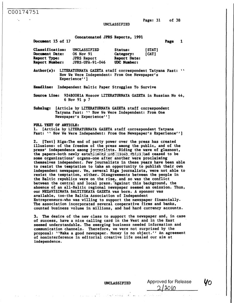 This document is a translated JPRS report from November 6, 1991, detailing the struggles of the independent newspaper NEZAVISIMAYA BALTIYSKAYA GAZETA in the Baltic region. The author, Tatyana Fast, describes the challenges of establishing an independent press in the post-Soviet environment, highlighting the pressures from political entities like the Communist Party of Latvia (CPL), the KGB, and the OMON militia. The report outlines the financial difficulties faced by independent media, including the high costs of paper, printing, and distribution, as well as the pressure from sponsors and the influence of 'mafiosi' groups. The author notes that by late 1991, the newspaper had ceased its political focus and shifted its content to topics such as UFOs, nutrition, and sex in an attempt to survive commercially. The document serves as a case study on the fragility of press freedom during the transition period following the collapse of party control in the Baltic states.
