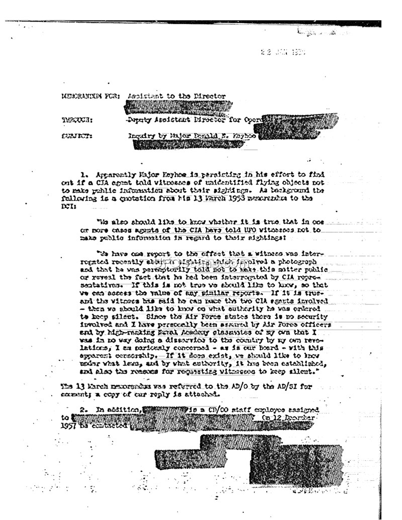 The document outlines internal CIA discussions regarding how to respond to inquiries from Major Donald E. Keyhoe, who was investigating allegations that CIA agents were silencing UFO witnesses. The agency decided to avoid confirming or denying involvement, instead opting to ask Keyhoe for the basis of his inquiry to stall or deflect the request.