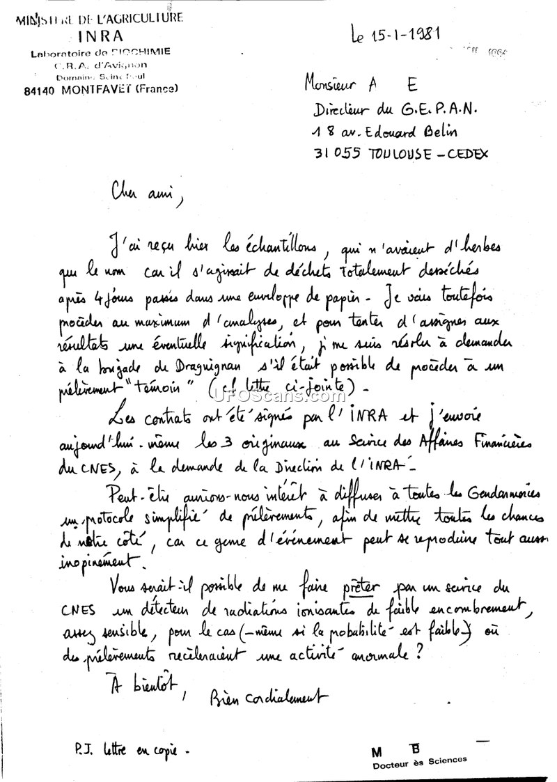 This collection of correspondence documents the biochemical analysis of plant samples collected from a landing site in Trans-en-Provence, France, following an incident on January 9, 1981. The analysis was conducted by a scientist at the INRA (National Institute of Agricultural Research) laboratory in Avignon, in collaboration with G.E.P.A.N. (the French government's UFO study group) and the local Gendarmerie. The correspondence tracks the receipt of plant samples—specifically 'Trèfle rampant' (creeping clover)—from the center of the landing trace and from control locations at varying distances. The scientist reports significant and unexpected biochemical findings in the samples taken from the center of the trace. These findings include a quantitative alteration of the pigment equipment, specifically a decrease in chlorophylls and an increase in their metallic-core-deprived derivatives. Furthermore, the analysis identified several completely new compounds in the center sample that were strictly absent in all control samples. The author expresses significant caution and surprise, noting that these biochemical 'monstrosities' do not match the effects observed in plants exposed to radiation, nor do they resemble any known mutant profiles. The scientist requests further collaboration, including the use of radiation detection equipment and the collection of seeds from the affected plants to monitor for long-term effects. The documents reflect a formal, scientific approach to investigating the physical traces left by an Unidentified Aerial Phenomenon, emphasizing the need for rigorous control samples and detailed comparative analysis.