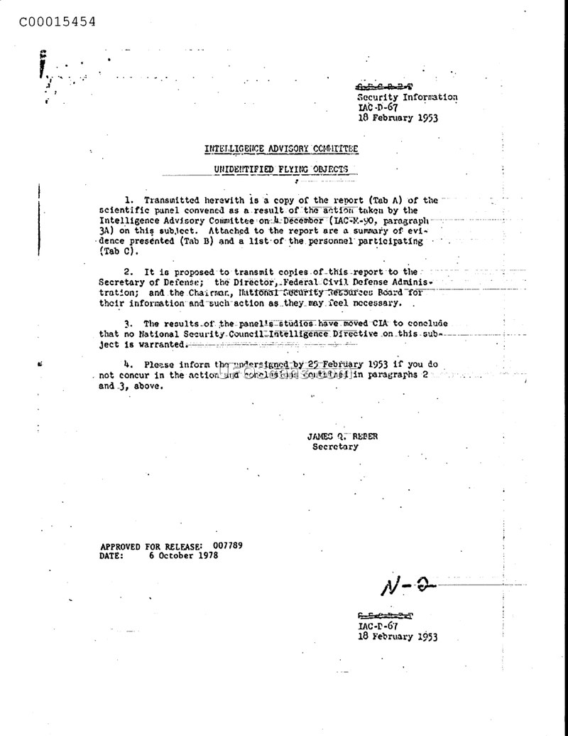 This document, dated February 18, 1953, is an Intelligence Advisory Committee memorandum transmitting the findings of a Scientific Panel convened to evaluate Unidentified Flying Objects (UFOs). The Panel, chaired by H. P. Robertson, reviewed evidence provided by the Air Technical Intelligence Center (ATIC) and other agencies, including 75 case histories, motion picture films, and radar data from 1948 to 1952. The Panel's primary conclusion was that UFOs did not pose a direct physical threat to national security and that there was no evidence of foreign hostile artifacts. However, the Panel expressed significant concern regarding the 'clogging of channels of communication' by irrelevant reports and the potential for 'false alarms' to distract from real threats. They argued that the 'special status' afforded to UFOs created a 'morbid national psychology' that could be exploited by hostile propaganda to induce hysteria. Consequently, the Panel recommended that national security agencies take immediate steps to strip UFOs of their special status and implement an integrated program of intelligence, training, and public education to train personnel to recognize and reject false indications quickly. The document includes detailed lists of evidence reviewed, such as balloon launch sites, radar manuals, and various intelligence reports, as well as a list of the panel members and interviewees, which included representatives from the CIA, ATIC, and the US Navy.