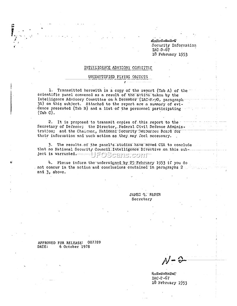 This document, dated 18 February 1953, is a memorandum from the Intelligence Advisory Committee (IAC) regarding the findings of a scientific panel convened to evaluate Unidentified Flying Objects (UFOs). The panel, chaired by H. P. Robertson, reviewed evidence provided by the Air Technical Intelligence Center (ATIC), including 75 case histories from 1951-1952, various project reports (GRUDGE, BLUE BOOK, STORK, TWINKLE, FOURCE), and photographic and radar data. The panel concluded that there was no evidence that UFOs represented a direct physical threat to national security. However, they expressed significant concern that the continued reporting of these phenomena, and the 'special status' afforded to them, created a danger to the orderly functioning of protective organs. Specifically, the panel argued that the volume of reports clogged communication channels and fostered a 'morbid national psychology' that could be exploited by hostile propaganda to induce hysteria or distrust of authority. To mitigate these risks, the panel recommended that national security agencies take immediate steps to strip UFOs of their special status and implement an integrated program of intelligence, training, and public education to help the public and military personnel recognize and reject false indications of hostile action. The memorandum proposes that these findings be shared with the Secretary of Defense, the Director of the Federal Civil Defense Administration, and the Chairman of the National Security Resources Board, and concludes that no National Security Council Intelligence Directive on the subject is warranted.