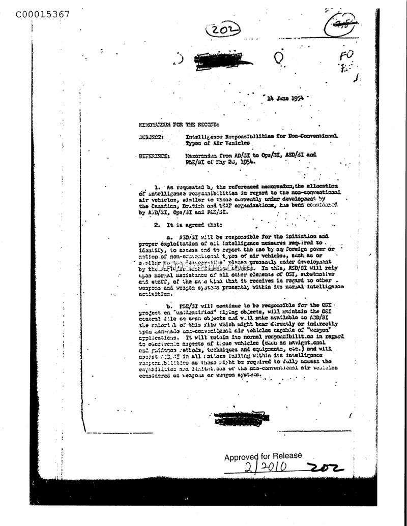 This memorandum, dated June 14, 1954, addresses the allocation of intelligence responsibilities concerning non-conventional air vehicles, specifically those similar to developments by Canadian and British organizations. The document establishes a clear division of labor between intelligence elements. ASD/SI is assigned responsibility for the initiation and exploitation of intelligence measures required to identify and report on foreign developments of non-conventional air vehicles, relying on the normal assistance of other OSI elements. Meanwhile, P&E/SI is designated to continue responsibility for the project concerning 'unidentified' flying objects. This includes maintaining a central file on such objects, making this material available to ASD/SI, and retaining responsibility for technical aspects such as navigation and guidance, while assisting ASD/SI in assessing the capabilities and limitations of these vehicles. The memorandum concludes that no further special action is required at that time regarding the definition or allocation of these responsibilities. The document is signed by representatives of ASD/SI, Ops/SI, and P&E/SI.