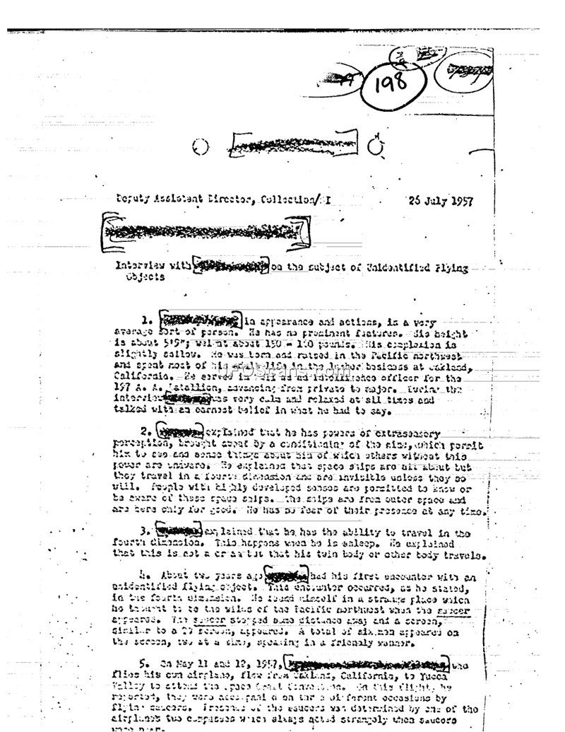 The subject claims to have extrasensory perception, the ability to travel in the fourth dimension, and to have had multiple encounters with unidentified flying objects, including a specific sighting in the desert on May 11-12, 1957.