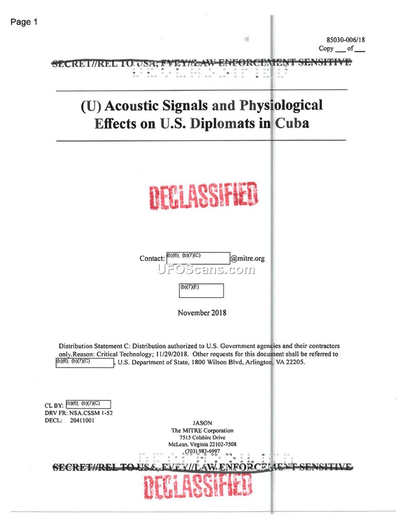 This JASON report, dated November 2018, provides a rapid-response assessment of a series of incidents affecting U.S. personnel stationed in Havana, Cuba. Affected individuals reported a variety of medical symptoms, including persistent sleep disturbance, visual symptoms, cognitive difficulty, headaches, and balance problems. Many also reported hearing unusual, high-pitched, and directional sounds. JASON was tasked with evaluating the potential sources of these acoustic sensations and suggesting protective measures. The study reviewed audio and video recordings provided by embassy personnel, case reports, and medical data. JASON concluded that the recorded sounds are not electronic in origin but are instead consistent with bioacoustic noise, specifically the call of the Indies short-tailed cricket, Anurogryllis celerinictus. The report notes that the spectral properties of the recordings match the cricket's call when room echoes are considered. JASON found no evidence that the recorded signals were produced by high-power radiofrequency or ultrasound pulses, and judged it highly unlikely that pulsed RF could mimic acoustic signals in the brain via the Frey effect. The report highlights a significant lack of baseline medical data for the affected personnel, making it difficult to establish a causal link between the reported sounds and the observed medical conditions. JASON also expressed concerns regarding the methodology and lack of peer-reviewed data in studies conducted by Dr. Michael Hoffer, noting that his diagnostic system lacked FDA approval. The report suggests that while the sounds themselves may not be harmful, they could potentially be used by an adversary as a form of deception to mask other activities. JASON recommends further research into the insect hypothesis, including additional recordings and field experiments, and emphasizes the critical need for pre-deployment baseline medical testing for all U.S. personnel.