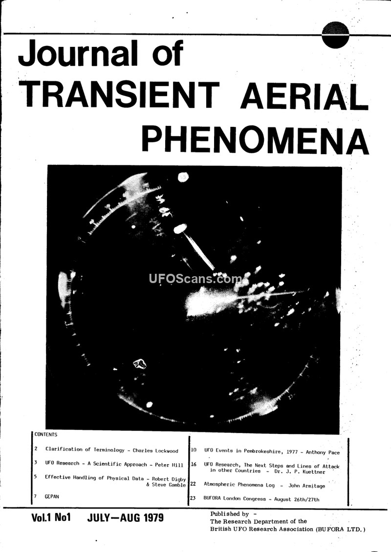 This document is the inaugural issue of the 'Journal of Transient Aerial Phenomena,' published in July-August 1979 by the Research Department of the British UFO Research Association (BUFORA). The journal was established to provide a platform for longer, in-depth research articles and case studies, aiming to elevate the standards of UFO research in Great Britain. The editorial by Anthony Pace emphasizes a shift toward a less emotive, more scientific terminology, suggesting the replacement of the term 'UFO' with 'Transient Aerial Phenomena' to avoid the baggage associated with popular ufology. The journal features several key articles: Charles Lockwood discusses the clarification of terminology and the need for a scientific framework; Peter A. Hill argues for the maturation of UFO research from a hobby to a scientific discipline, stressing the importance of data collection and statistical analysis; Robert Digby and Steve Gamble detail the creation of a Physical Data Section within BUFORA to handle physical evidence cases; and Dr. J. P. Kuettner provides insights into the American Institute of Aeronautics and Astronautics (AIAA) UFO Sub-Committee's experiences. Additionally, the journal includes a summary of the French GEPAN (Unidentified Aerospace Phenomena Study Group) and a detailed report by Anthony Pace on the 1977 UFO events in Pembrokeshire, South West Wales, which included numerous reports of humanoid entities and physical traces. The journal also features an 'Atmospheric Phenomena Log' by John Armitage, which explores natural explanations for sightings, such as mirages. The overall tone of the journal is one of serious, skeptical, and methodical inquiry, seeking to bridge the gap between amateur research and the professional scientific community.