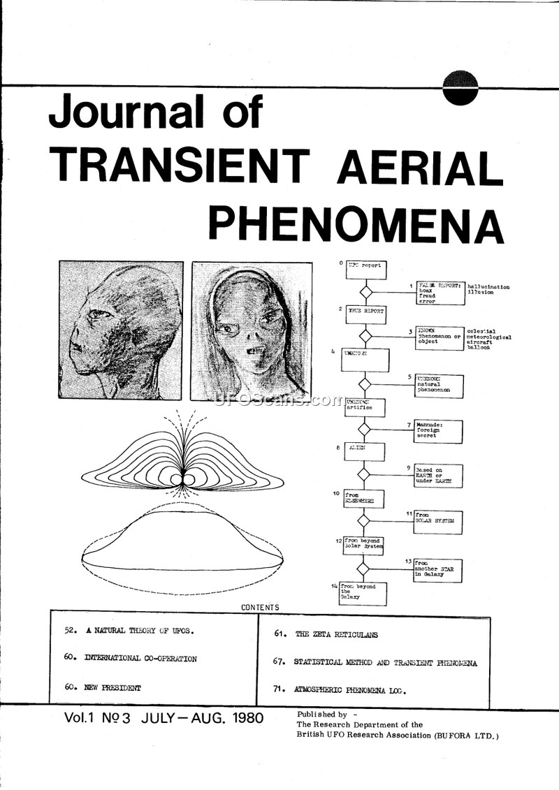 This issue of the Journal of Transient Aerial Phenomena, published in July/August 1980 by the British UFO Research Association (BUFORA), serves as a platform for serious, scientific inquiry into unidentified aerial phenomena. The editorial by Anthony Pace challenges the trend of conflating UFO reports with paranormal or Fortean phenomena, urging investigators to prioritize objective data collection and careful observation over sensationalism. A central feature of this issue is Stuart Campbell's 'A Natural Theory of UFOs,' which proposes that UFOs are not necessarily extraterrestrial spacecraft but rather atmospheric phenomena, specifically related to ball lightning and electromagnetic effects. Campbell argues that the consistent discoid shape reported by witnesses is a natural consequence of rotating magnetic dipoles in the atmosphere, rather than a design choice by alien intelligence. The journal also includes a detailed analysis of the Zeta Reticulans, focusing on the Betty and Barney Hill abduction case and the subsequent star map research conducted by Marjorie Fish. This section explores the possibility of extraterrestrial life while maintaining a critical eye on the anatomical and evolutionary implications of the reported entities. Furthermore, Peter Hill contributes an article on the importance of statistical methods in UFO research, emphasizing that rigorous data analysis is essential for progress and that researchers must be wary of common pitfalls, such as confusing correlation with causation. The 'Atmospheric Phenomena Log' by John Armitage examines reports of unusual substances falling from the sky, such as 'Pwdre Ser' or 'Star-Slimer,' providing scientific explanations for these occurrences, often attributing them to biological origins or man-made waste. The journal concludes with letters from readers and updates on international cooperation, reinforcing the association's commitment to a disciplined, scientific approach to the study of UFOs.