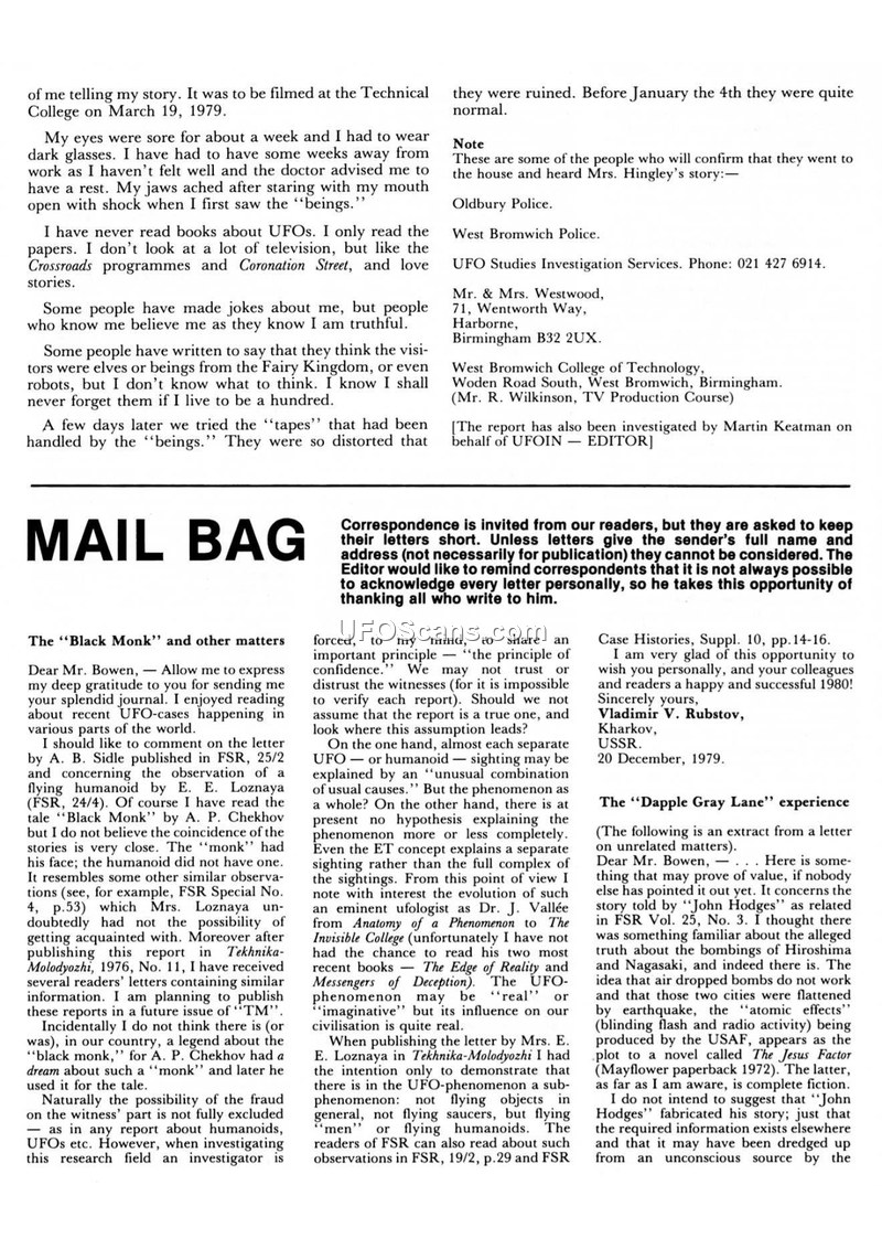 This document is a 1979-1980 issue of the Flying Saucer Review, featuring reader correspondence and international UFO sighting reports. It highlights ongoing debates regarding government secrecy, the scientific validity of UAP research, and specific case studies from around the world.