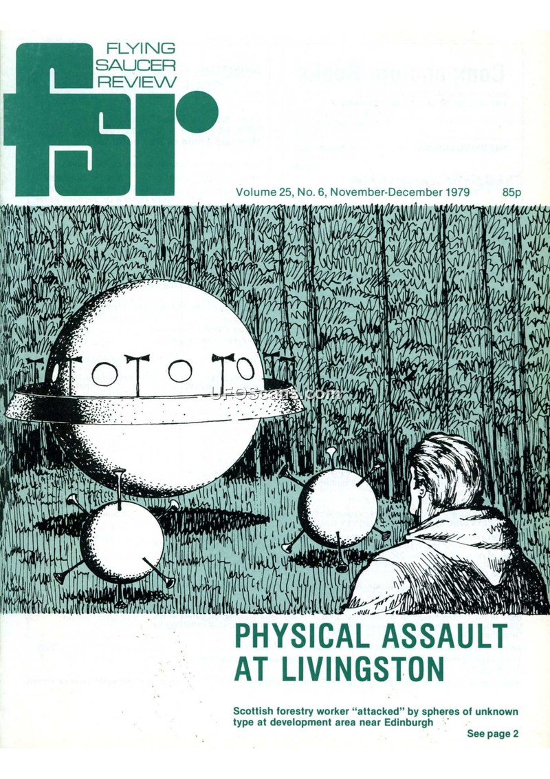 This issue of Flying Saucer Review (Volume 25, No. 6, April 1980) features a detailed investigation into a reported UFO encounter in Livingston, Scotland. The primary report, authored by Martin Keatman and Andrew Collins, details the experience of Bob Taylor, a forestry foreman for the Livingston Development Corporation. On November 9, 1979, while working in Dechmont Woods, Taylor encountered a large, grey, Saturn-shaped object resting on the ground. He reported that two smaller spheres with spikes emerged from the object and moved toward him, resulting in a 'wooshing' sound, a strong smell, and a sensation of being pulled by his trousers. Taylor subsequently lost consciousness. Upon regaining awareness, he found the object gone and himself in pain, with physical injuries to his chin and leg. The investigation includes details of the physical traces left at the site, such as indentations in the grass, and notes that the witness's account remained consistent throughout subsequent questioning. The magazine also includes a tribute to the late UFO researcher Aimé Michel and a continuation of Leonard H. Stringfield's series on UFO retrievals, which discusses alleged military recovery operations of crashed craft and debris, including references to the 1947 Roswell incident and the 'green fire-ball' phenomena.