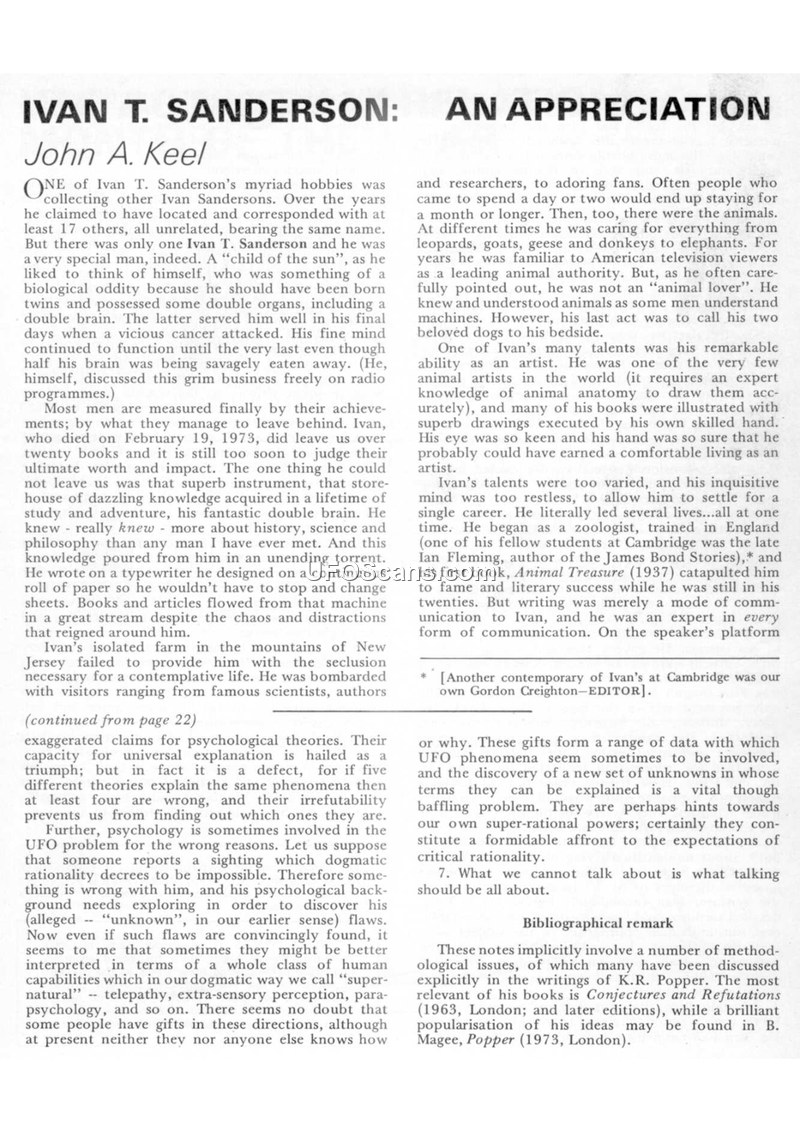 This document is a biographical appreciation of Ivan T. Sanderson, written by John A. Keel. It details Sanderson's life as a zoologist, author, and researcher of unexplained phenomena. Sanderson, who was trained at Cambridge, was a prolific writer and a significant figure in the study of UAP and Fortean topics. The text highlights his founding of the Society for the Investigation of the Unexplained (SITU) and his collaborative efforts with other researchers in the field. Keel provides personal anecdotes about Sanderson, including his residence in New Jersey, his work on various books such as 'Uninvited Visitors' and 'Invisible Residents', and his interest in psychic phenomena as a potential explanation for UAP. The document also notes Sanderson's death on February 19, 1973, and mentions his wife, Marion Fawcett, who continued his work. Additionally, the text touches upon Sanderson's skepticism regarding the 'Men in Black' phenomenon and his use of a magnetic UFO detector at his home, which reportedly triggered alarms in 1967-68.