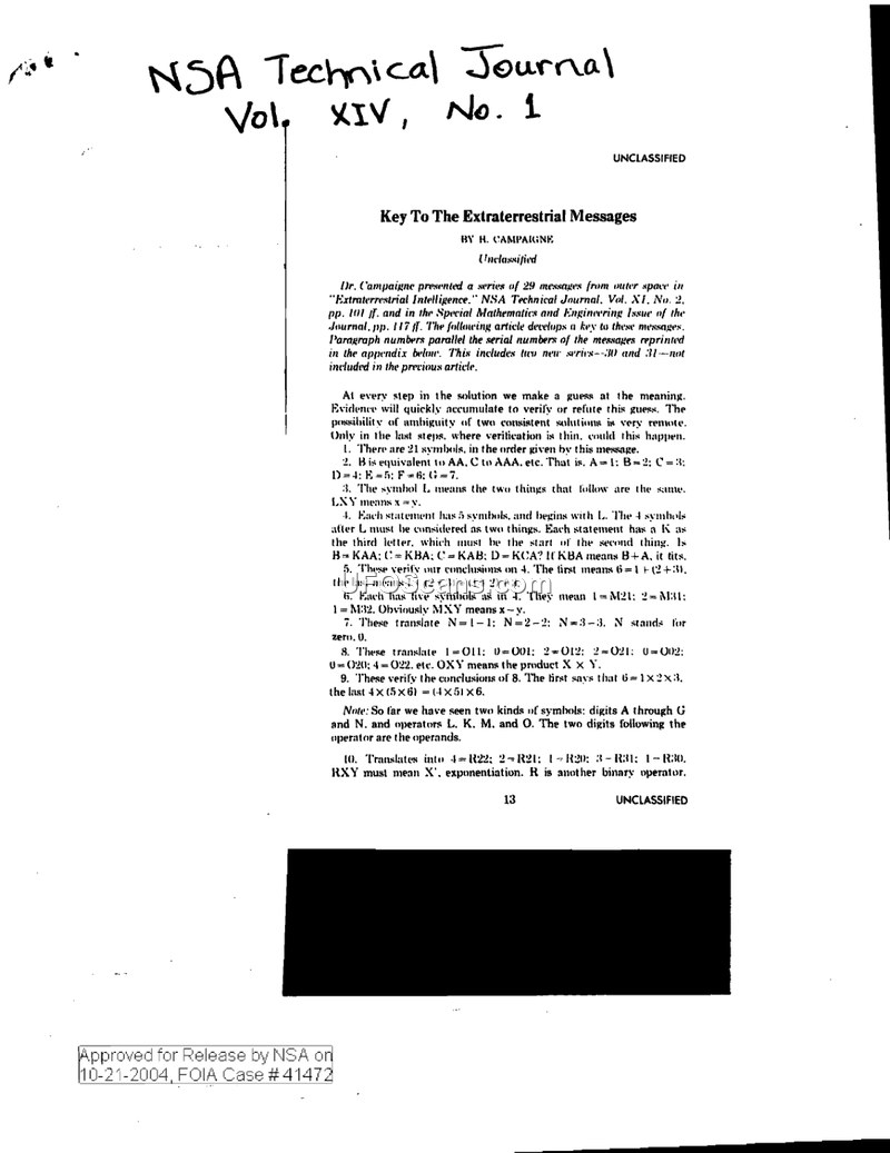 This document, published in the NSA Technical Journal, Vol. XIV, No. 1, presents a detailed linguistic and mathematical analysis of a series of 29 messages purportedly received from outer space. The author, H. Campaigne, outlines a methodology for decoding these messages by treating them as a structured language. The analysis proceeds by identifying basic symbols (digits A through G and N) and operators (L, K, M, O, S, T, V, Q, JNV, NKV, NLV). Through iterative testing and logical deduction, the author attempts to establish the meaning of these symbols, concluding that they represent sophisticated mathematical and logical concepts, including arithmetic, exponentiation, division, Boolean logic, and set theory. The author notes that the messages appear to be non-continuous and are separated by pauses that function as punctuation. A significant portion of the analysis focuses on the later messages, which contain sequences that the author hypothesizes may correspond to a periodic table of chemical elements, noting that elements 57 through 71 are grouped together, consistent with the classification of rare earths. The author concludes that while the syntax and values of the extraterrestrial culture remain complex, the use of fundamental concepts such as numbers, sets, and physical constants suggests a commonality between the sender and human civilization. The document includes an appendix listing the 29 messages analyzed.