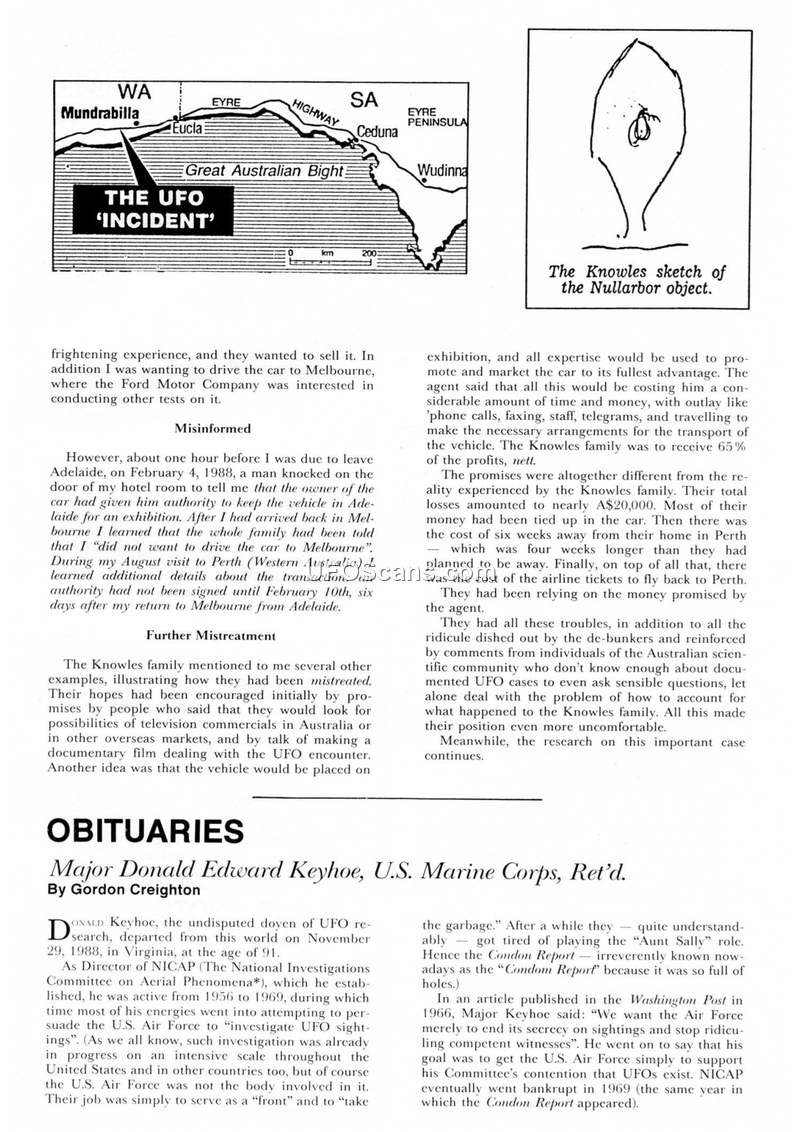 This document contains two distinct sections. The first section details the plight of the Knowles family following a UFO incident. After an encounter, the family was approached by an agent who promised to help them market their vehicle, which had been involved in the incident. Instead, the family suffered significant financial losses, totaling nearly A$20,000, and faced ridicule from the public and the scientific community. The second section provides obituaries for two prominent figures in the field of UFO research: Major Donald Edward Keyhoe and Peter F. Johnson. Major Keyhoe, a U.S. Marine Corps veteran and the director of NICAP, is remembered for his long-standing efforts to pressure the U.S. Air Force to disclose information regarding UFOs and his authorship of several books on the subject. Peter F. Johnson, a British researcher and engineer, is noted for his contributions to BUFORA and his work with radar during World War II. The document also includes a brief advertisement for the book 'Circular Evidence' by Colin Andrews and Pat Delgado.