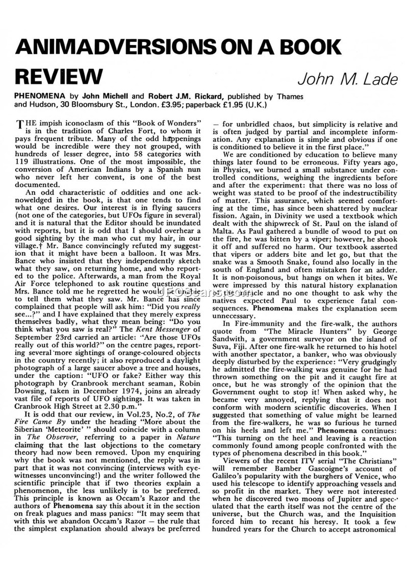 This document is a book review by John M. Lade of 'Phenomena' by John Michell and Robert J.M. Rickard. The review discusses the authors' approach to anomalous events, noting their tendency to group occurrences and their skepticism toward conventional explanations. Lade uses the review to explore the tension between scientific materialism and the reporting of unexplained phenomena. The text includes two specific case reports as examples of the types of incidents discussed in the book. The first is a report from September 1973 involving a jockey named Peter at Epsom Downs, who observed a disc-shaped object hovering 20 feet above the ground. The object emitted a strange noise, a blue haze, and flashes of yellow sparks, and the witness reported that it appeared to have a 'burnt electric hand drill' on its upper part. The second report, detailed in a note, involves David and Pamela Bance, who observed a large, fluorescent, orange-coloured object while driving near Sevenoaks in September 1974. The object was described as a 'big object, about the size of a terraced house' that eventually shrank to the size of a pinhead and disappeared. The document serves as both a critique of the literature surrounding UAP and a repository for anecdotal sighting reports.