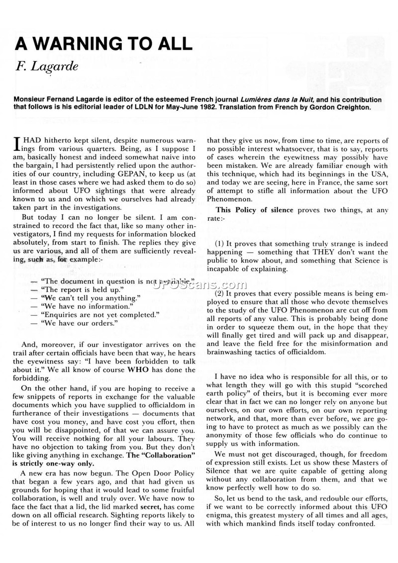 This document consists of two parts: an editorial by Fernand Lagarde, editor of the French journal Lumières dans la Nuit (May-June 1982), and a report by Gordon Creighton regarding a UFO incident in Uruguay. In the editorial, Lagarde expresses frustration with the lack of transparency from official bodies like GEPAN, arguing that there is a deliberate 'policy of silence' designed to discourage researchers and hide the truth about UFO phenomena. He asserts that the public is being misled and that independent researchers must continue their work despite official obstruction. The second part of the document details a 1980 incident in the Department of San José, Uruguay, investigated by the Argentinian group CEFANC. A rural blacksmith, Juan Froche Jiacola, reported two young, thin-necked humanoids attempting to steal sun-dried beef from his property. During the encounter, Froche sustained burns on his hand when he attempted to close his door against one of the entities. His wife, Ana Parodi de Froche, also witnessed the aftermath. The investigators noted that Froche had a vertical scar on his forehead, which he attributed to a past surgery. Medical examination by Dr. Ramón Nuñez confirmed the presence of burns on the witness's hand. CEFANC investigators remained non-committal regarding the authenticity of the case, noting that they were unable to verify the claims definitively.