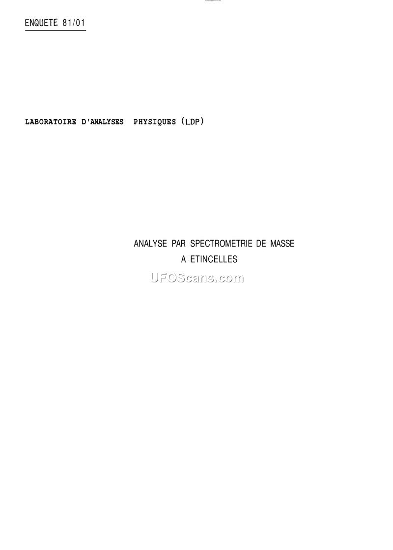 This document consists of a cover letter and technical laboratory reports dated October 23, 1981, from the Laboratoire d'Analyses Physiques (LDP) to GEPAN (C.N.E.S.). The correspondence concerns the results of mass spectrometry analysis performed on two soil samples and associated black deposits, referenced under case number 81/01 and laboratory reference GK/AG 81-0477. The laboratory director, G. K., informs the recipient, Monsieur V, that the differences observed in the soil samples are considered insignificant and may be related to a phosphate and zinc-based primer. Regarding the black deposits found on the soil, the laboratory suggests they may consist of a carbon-black based paint. They propose that a future comparative analysis between these deposits and standard black paints used on the undercarriages of heavy machinery would be beneficial. The document includes detailed tables of elemental analysis results for the samples, as well as graphical representations of the findings. The laboratory provides standard observations regarding the limitations of their semi-quantitative analysis, noting that results are accurate to a factor of three and that certain elements may be over- or under-estimated due to the nature of the spectrometry process.