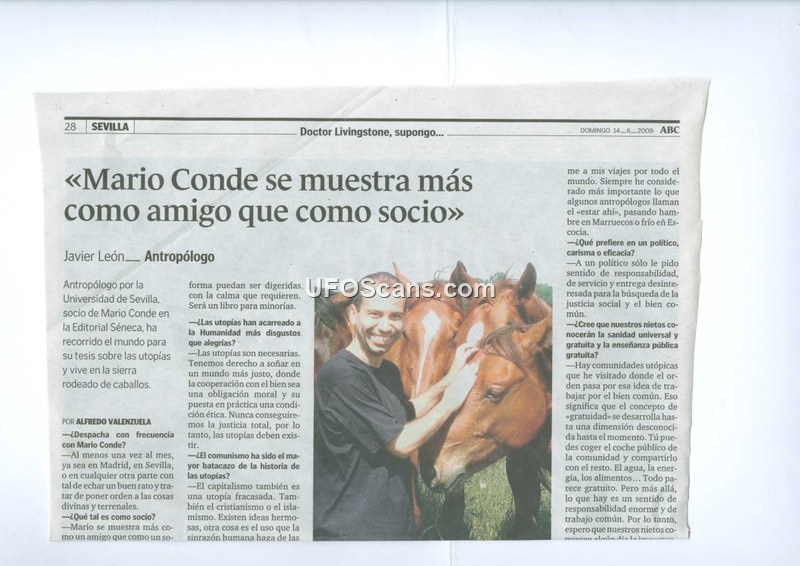 This document is a newspaper interview published in the Spanish newspaper ABC on June 14, 2009. The article features an interview with Javier León, an anthropologist from the University of Seville. León discusses his professional and personal relationship with Mario Conde, with whom he is a partner in Editorial Séneca. The conversation covers a wide range of topics, including León's research on utopias, his travels, and his philosophical views on politics, capitalism, and social responsibility. León reflects on the nature of utopian communities, mentioning his travels to places like California and Mongolia, and expresses his views on the current political climate in Spain, specifically criticizing nationalism and totalitarianism. He emphasizes the importance of civil responsibility and the pursuit of the common good over material wealth. The article provides a personal look at León's life, including his residence in the Sierra region and his affinity for horses.