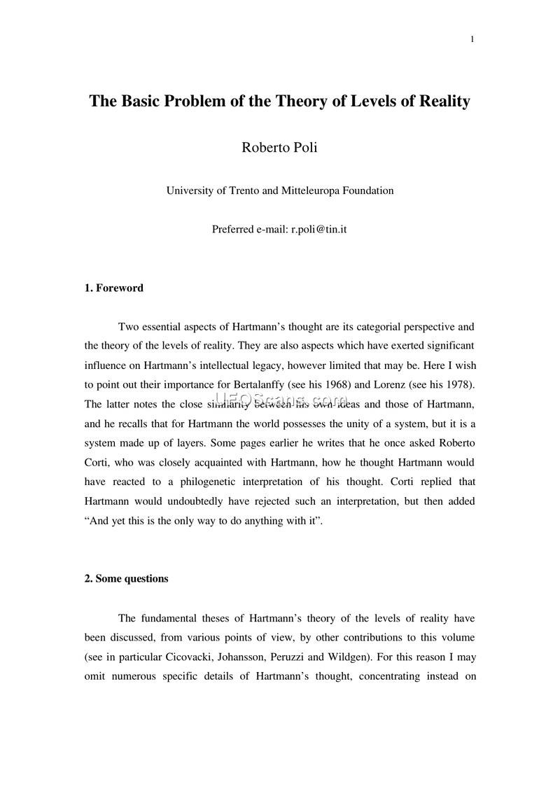 This academic paper by Roberto Poli, affiliated with the University of Trento and the Mitteleuropa Foundation, provides a comprehensive examination of the theory of levels of reality. Poli begins by situating the discussion within the intellectual legacy of Nicolai Hartmann, whose work on categorial perspectives and stratified reality serves as the primary foundation for the inquiry. The author notes that while the theory of levels has influenced thinkers like Bertalanffy and Lorenz, it remains an under-discussed topic in contemporary literature, often conflated with levels of interpretation or description rather than being treated as a strictly ontological matter.