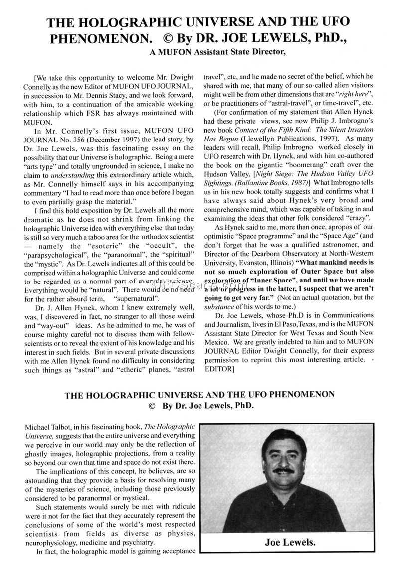 This document, published in the December 1997 issue of the MUFON UFO JOURNAL, features an essay by Dr. Joe Lewels titled 'The Holographic Universe and the UFO Phenomenon.' The text introduces the holographic model of the universe, popularized by Michael Talbot, which suggests that the perceived physical world is a projection from a deeper reality where space and time do not exist in the traditional sense. Dr. Lewels argues that this model, supported by the work of physicists like David Bohm and neurophysiologists like Karl Pribram, offers a scientific framework to explain UFOs, alien abductions, and paranormal events. The author contends that if the universe is holographic, then phenomena previously dismissed as supernatural—such as alien craft appearing and disappearing, passing through solid objects, or traveling vast distances instantaneously—can be understood as manifestations of non-locality. The document highlights the work of various researchers, including Dr. J. Allen Hynek, Dr. Raymond Moody, and Dr. Brian Weiss, to bridge the gap between mainstream science and the study of anomalous phenomena. It suggests that ufologists should embrace these quantum principles to move beyond 'nuts-and-bolts' analysis. Additionally, the document includes a brief mention of the 1976 Teheran UFO incident, noting that it involved multiple witnesses and an attempt by Iranian F-4 Phantoms to intercept an unknown object. The article concludes by emphasizing that the holographic model may eventually lead the scientific community to accept ufology as a legitimate field of inquiry.